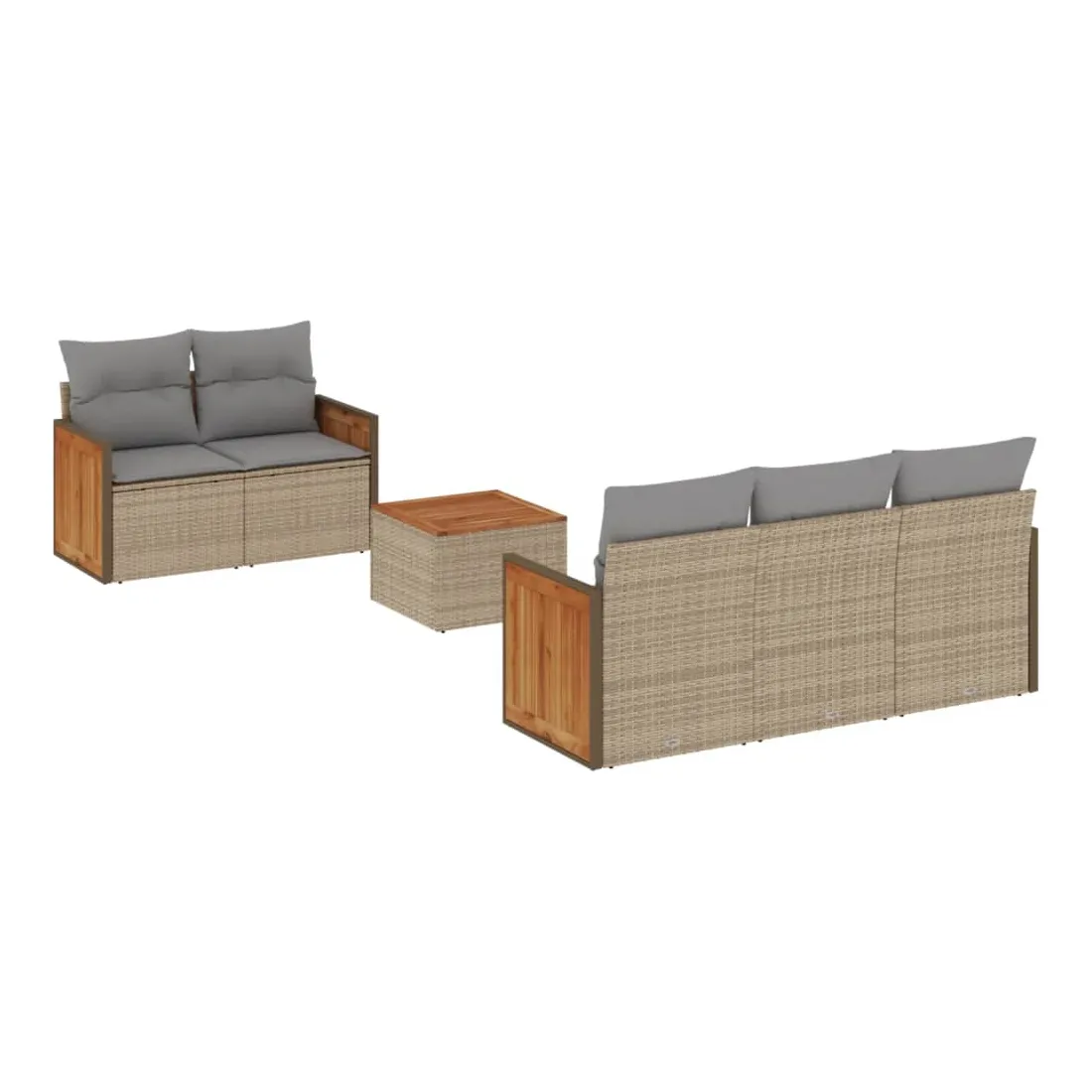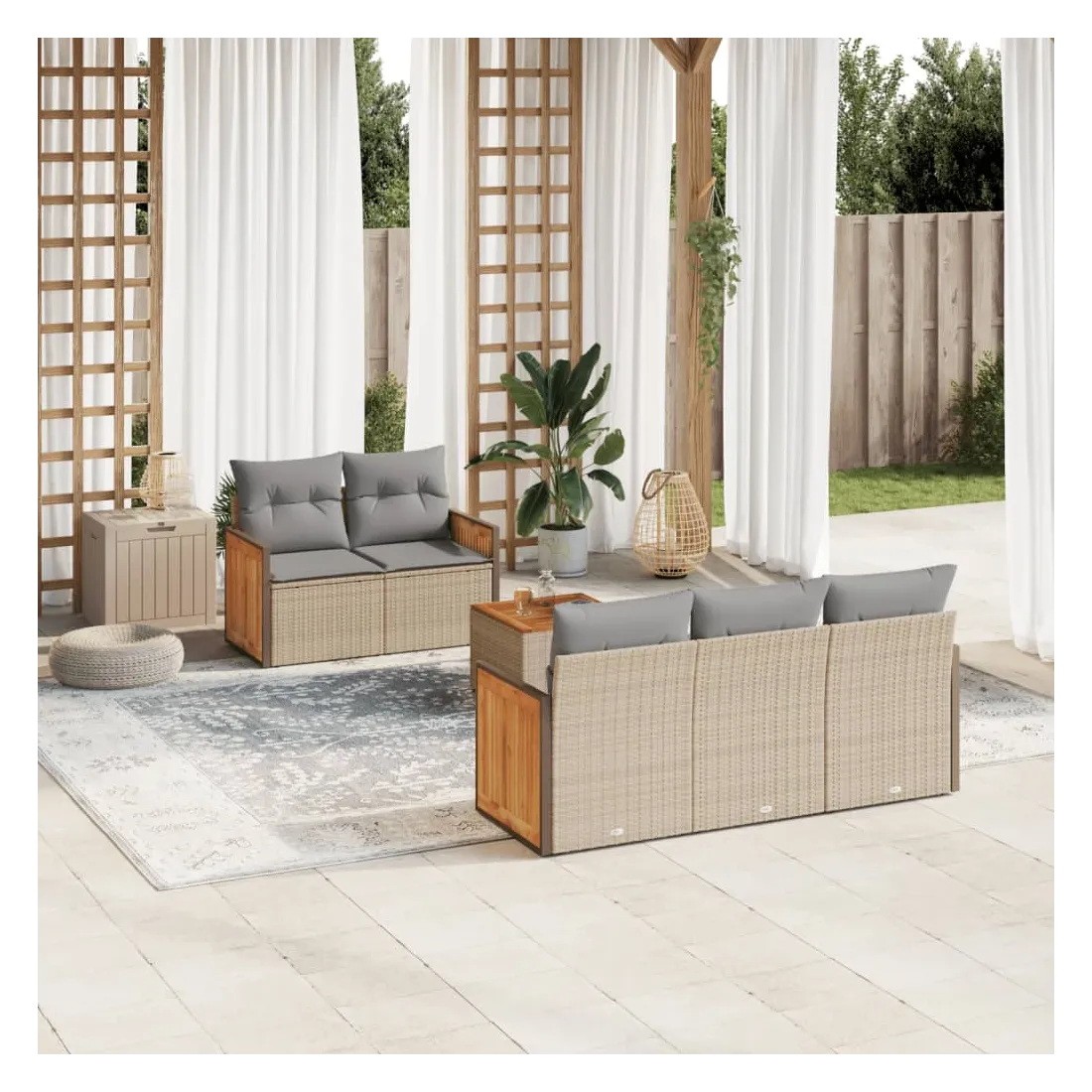 Cet ensemble de canapés de jardin est le complément parfait de votre arrière-cour, terrasse ou patio, offrant un espace confortable et accueillant pour discuter avec la famille et les amis ou simplement se détendre et profiter de l'extérieur. Matériau durable : la résine tressée, également connue sous le nom de poly rotin, est un matériau synthétique solide et nécessitant peu d'entretien qui ressemble au rotin naturel. Il est léger, facile à nettoyer et couramment utilisé pour les meubles d'extérieur en raison de sa durabilité et de ses propriétés de résistance aux intempéries.Expérience d'assise confortable : ce mobilier d'extérieur, doté de coussins épais, offre une expérience d'assise confortable.Dessus stable et facile à nettoyer : cette table de jardin a un dessus en bois d'acacia robuste, durable et facile à nettoyer avec un chiffon humide.Housse amovible et lavable : ces coussins de siège sont dotés de housses amovibles pour un lavage et un entretien faciles.Conception modulaire : cet ensemble de meubles d'extérieur a une conception modulaire, ce qui le rend complètement flexible et facile à déplacer, afin que vous puissiez créer un agencement de meubles d'extérieur personnalisé. Bon à savoir :Pour que vos meubles d'extérieur restent beaux, nous vous recommandons de les protéger avec une housse imperméable.