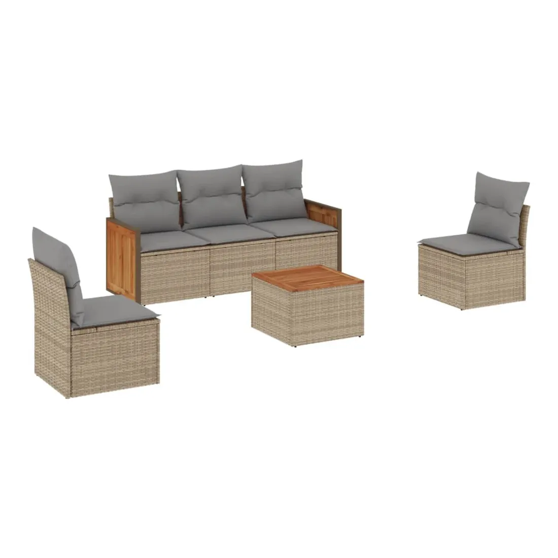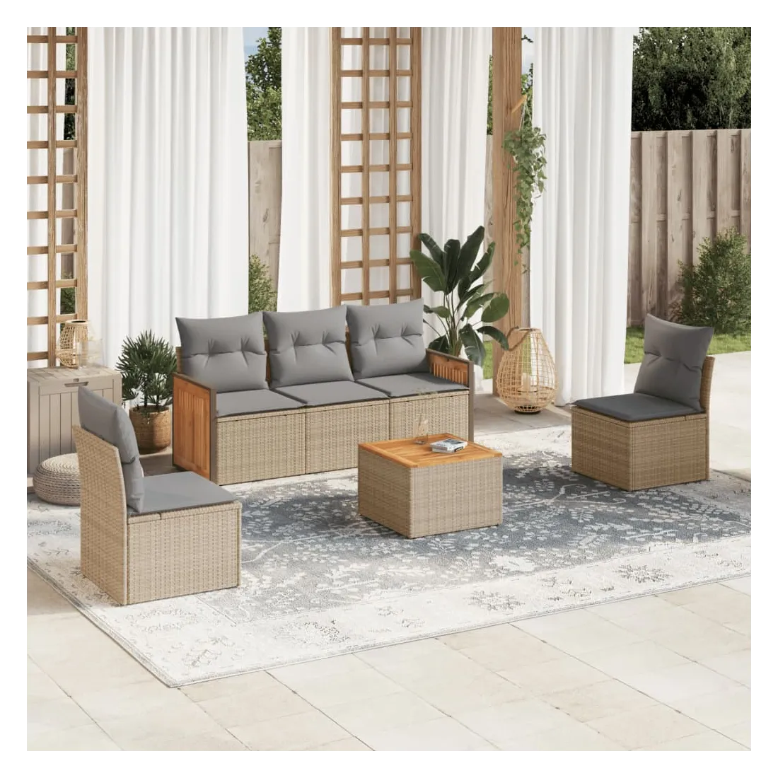Cet ensemble de canapés de jardin est le complément parfait de votre arrière-cour, terrasse ou patio, offrant un espace confortable et accueillant pour discuter avec la famille et les amis ou simplement se détendre et profiter de l'extérieur. Matériau durable : la résine tressée, également connue sous le nom de poly rotin, est un matériau synthétique solide et nécessitant peu d'entretien qui ressemble au rotin naturel. Il est léger, facile à nettoyer et couramment utilisé pour les meubles d'extérieur en raison de sa durabilité et de ses propriétés de résistance aux intempéries.Expérience d'assise confortable : ce mobilier d'extérieur, doté de coussins épais, offre une expérience d'assise confortable.Dessus stable et facile à nettoyer : cette table de jardin a un dessus en bois d'acacia robuste, durable et facile à nettoyer avec un chiffon humide.Housse amovible et lavable : ces coussins de siège sont dotés de housses amovibles pour un lavage et un entretien faciles.Conception modulaire : cet ensemble de meubles d'extérieur a une conception modulaire, ce qui le rend complètement flexible et facile à déplacer, afin que vous puissiez créer un agencement de meubles d'extérieur personnalisé. Bon à savoir :Pour que vos meubles d'extérieur restent beaux, nous vous recommandons de les protéger avec une housse imperméable.