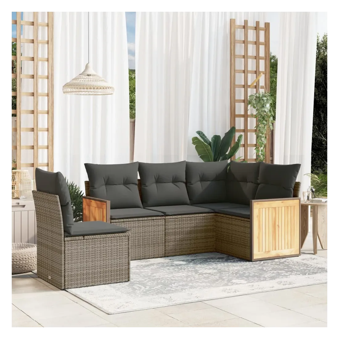 Cet ensemble de canapés de jardin est le complément parfait de votre arrière-cour, terrasse ou patio, offrant un espace confortable et accueillant pour discuter avec la famille et les amis ou simplement se détendre et profiter de l'extérieur. Matériau durable : la résine tressée, également connue sous le nom de poly rotin, est un matériau synthétique solide et nécessitant peu d'entretien qui ressemble au rotin naturel. Il est léger, facile à nettoyer et couramment utilisé pour les meubles d'extérieur en raison de sa durabilité et de ses propriétés de résistance aux intempéries.Expérience d'assise confortable : ce mobilier d'extérieur, doté de coussins épais, offre une expérience d'assise confortable.Housse amovible et lavable : ces coussins de siège sont dotés de housses amovibles pour un lavage et un entretien faciles.Conception modulaire : cet ensemble de meubles d'extérieur a une conception modulaire, ce qui le rend complètement flexible et facile à déplacer, afin que vous puissiez créer un agencement de meubles d'extérieur personnalisé. Bon à savoir :Pour que vos meubles d'extérieur restent beaux, nous vous recommandons de les protéger avec une housse imperméable.