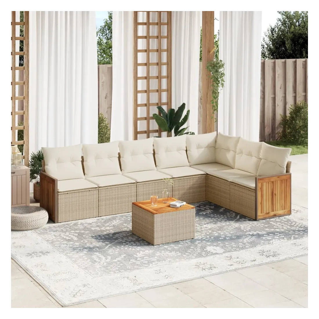 Cet ensemble de canapés de jardin est le complément parfait de votre arrière-cour, terrasse ou patio, offrant un espace confortable et accueillant pour discuter avec la famille et les amis ou simplement se détendre et profiter de l'extérieur. Matériau durable : la résine tressée, également connue sous le nom de poly rotin, est un matériau synthétique solide et nécessitant peu d'entretien qui ressemble au rotin naturel. Il est léger, facile à nettoyer et couramment utilisé pour les meubles d'extérieur en raison de sa durabilité et de ses propriétés de résistance aux intempéries.Expérience d'assise confortable : ce mobilier d'extérieur, doté de coussins épais, offre une expérience d'assise confortable.Dessus stable et facile à nettoyer : cette table de jardin a un dessus en bois d'acacia robuste, durable et facile à nettoyer avec un chiffon humide.Housse amovible et lavable : ces coussins de siège sont dotés de housses amovibles pour un lavage et un entretien faciles.Conception modulaire : cet ensemble de meubles d'extérieur a une conception modulaire, ce qui le rend complètement flexible et facile à déplacer, afin que vous puissiez créer un agencement de meubles d'extérieur personnalisé. Bon à savoir :Pour que vos meubles d'extérieur restent beaux, nous vous recommandons de les protéger avec une housse imperméable.
