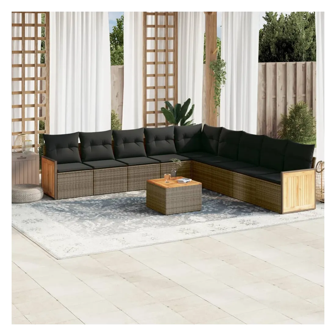 Cet ensemble de canapés de jardin est le complément parfait de votre arrière-cour, terrasse ou patio, offrant un espace confortable et accueillant pour discuter avec la famille et les amis ou simplement se détendre et profiter de l'extérieur. Matériau durable : la résine tressée, également connue sous le nom de poly rotin, est un matériau synthétique solide et nécessitant peu d'entretien qui ressemble au rotin naturel. Il est léger, facile à nettoyer et couramment utilisé pour les meubles d'extérieur en raison de sa durabilité et de ses propriétés de résistance aux intempéries.Expérience d'assise confortable : ce mobilier d'extérieur, doté de coussins épais, offre une expérience d'assise confortable.Dessus stable et facile à nettoyer : cette table de jardin a un dessus en bois d'acacia robuste, durable et facile à nettoyer avec un chiffon humide.Housse amovible et lavable : ces coussins de siège sont dotés de housses amovibles pour un lavage et un entretien faciles.Conception modulaire : cet ensemble de meubles d'extérieur a une conception modulaire, ce qui le rend complètement flexible et facile à déplacer, afin que vous puissiez créer un agencement de meubles d'extérieur personnalisé. Bon à savoir :Pour que vos meubles d'extérieur restent beaux, nous vous recommandons de les protéger avec une housse imperméable.