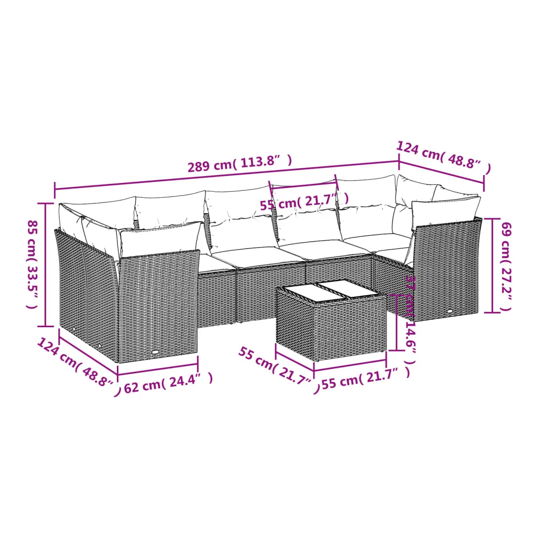 - Dimensions totales du canapé : 289 x 124 x 69 cm (l x P x H)