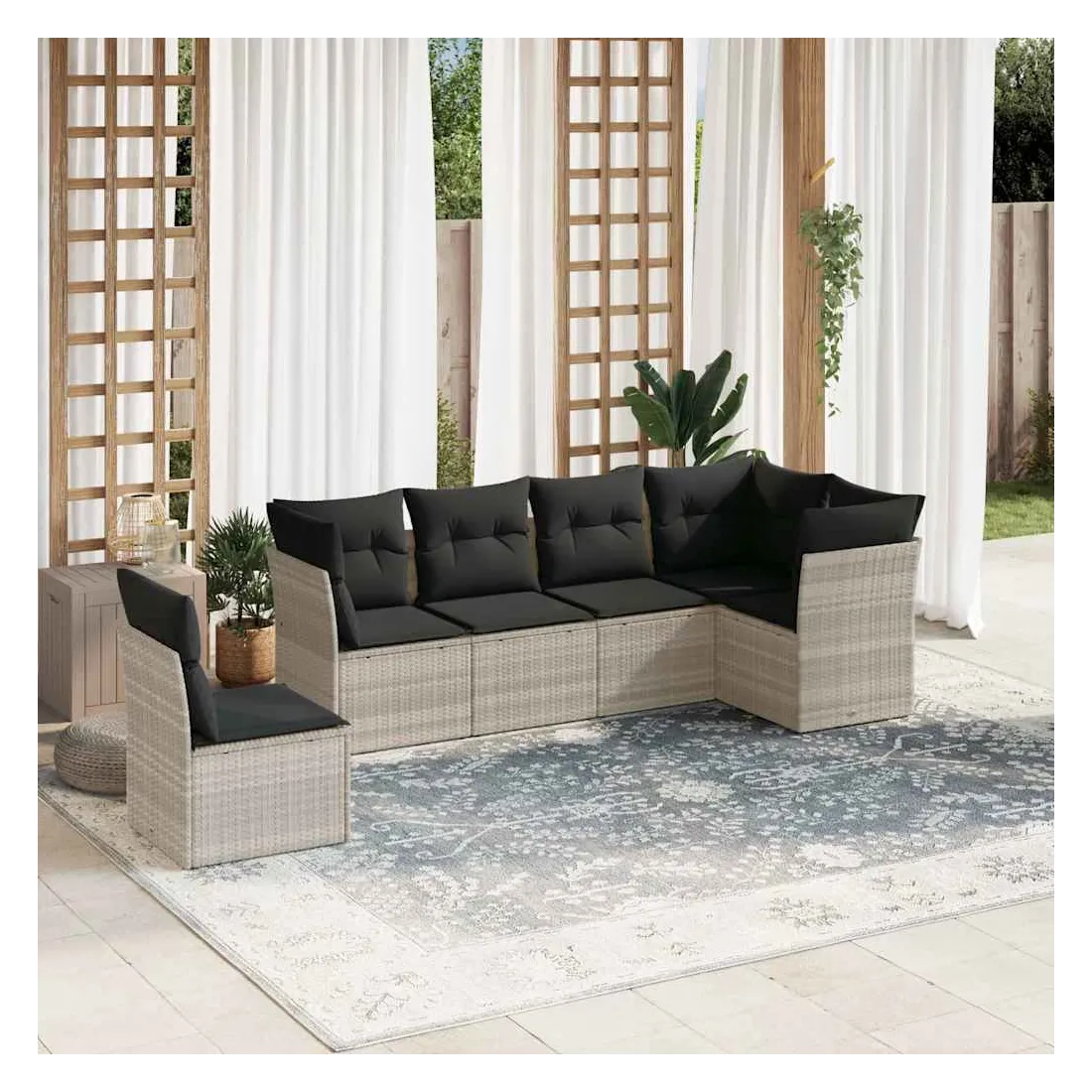 Cet ensemble de canapés de jardin est le complément parfait de votre arrière-cour, terrasse ou patio, offrant un espace confortable et accueillant pour discuter avec la famille et les amis ou simplement se détendre et profiter de l'extérieur. Matériau durable : la résine tressée, également connue sous le nom de poly rotin, est un matériau synthétique solide et nécessitant peu d'entretien qui ressemble au rotin naturel. Il est léger, facile à nettoyer et couramment utilisé pour les meubles d'extérieur en raison de sa durabilité et de ses propriétés de résistance aux intempéries.Fonction de rangement avec sac résistant à l'eau : chaque siège de jardin dispose d'un espace de rangement sous l'assise, complété par un sac résistant à l'eau pour ranger les coussins, les jouets et d'autres objets. Les sacs intérieurs sont dotés d'un couvercle et peuvent être solidement fixés aux sièges à l'aide de bandes auto-agrippantes pour plus de stabilité.Housse amovible et lavable : ces coussins de siège sont dotés de housses amovibles pour un lavage et un entretien faciles.Conception modulaire : cet ensemble de meubles d'extérieur a une conception modulaire, ce qui le rend complètement flexible et facile à déplacer, afin que vous puissiez créer un agencement de meubles d'extérieur personnalisé. Bon à savoir :Pour que vos meubles d'extérieur restent beaux, nous vous recommandons de les protéger avec une housse imperméable.