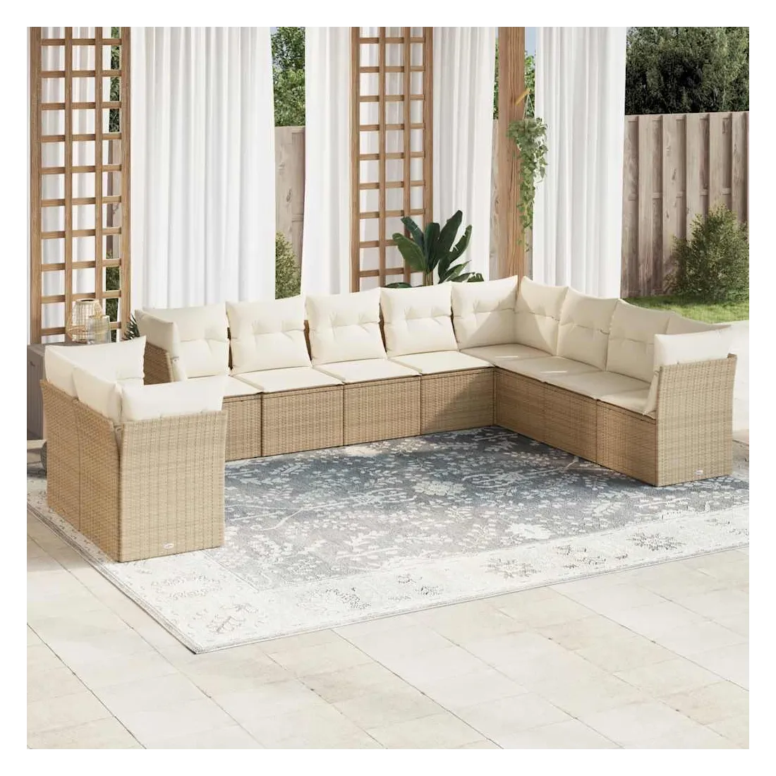 Cet ensemble de canapés de jardin est le complément parfait de votre arrière-cour, terrasse ou patio, offrant un espace confortable et accueillant pour discuter avec la famille et les amis ou simplement se détendre et profiter de l'extérieur. Matériau durable : la résine tressée, également connue sous le nom de poly rotin, est un matériau synthétique solide et nécessitant peu d'entretien qui ressemble au rotin naturel. Il est léger, facile à nettoyer et couramment utilisé pour les meubles d'extérieur en raison de sa durabilité et de ses propriétés de résistance aux intempéries.Fonction de rangement avec sac résistant à l'eau : chaque siège de jardin dispose d'un espace de rangement sous l'assise, complété par un sac résistant à l'eau pour ranger les coussins, les jouets et d'autres objets. Les sacs intérieurs sont dotés d'un couvercle et peuvent être solidement fixés aux sièges à l'aide de bandes auto-agrippantes pour plus de stabilité.Housse amovible et lavable : ces coussins de siège sont dotés de housses amovibles pour un lavage et un entretien faciles.Conception modulaire : cet ensemble de meubles d'extérieur a une conception modulaire, ce qui le rend complètement flexible et facile à déplacer, afin que vous puissiez créer un agencement de meubles d'extérieur personnalisé. Bon à savoir :Pour que vos meubles d'extérieur restent beaux, nous vous recommandons de les protéger avec une housse imperméable.