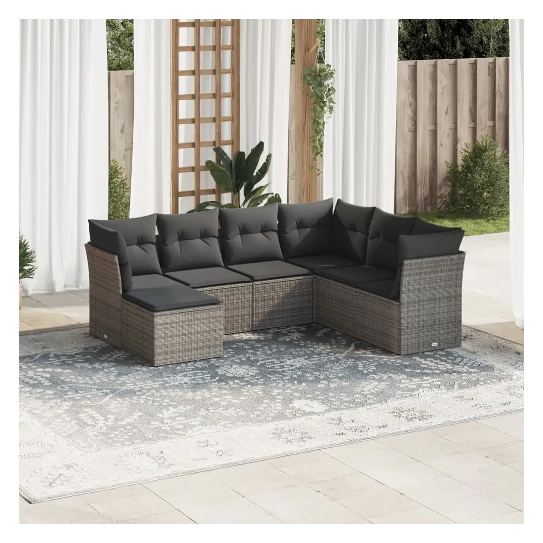 Cet ensemble de canapés de jardin est le complément parfait de votre arrière-cour, terrasse ou patio, offrant un espace confortable et accueillant pour discuter avec la famille et les amis ou simplement se détendre et profiter de l'extérieur. Matériau durable : la résine tressée, également connue sous le nom de poly rotin, est un matériau synthétique solide et nécessitant peu d'entretien qui ressemble au rotin naturel. Il est léger, facile à nettoyer et couramment utilisé pour les meubles d'extérieur en raison de sa durabilité et de ses propriétés de résistance aux intempéries.Fonction de rangement avec sac résistant à l'eau : chaque siège de jardin dispose d'un espace de rangement sous l'assise, complété par un sac résistant à l'eau pour ranger les coussins, les jouets et d'autres objets. Les sacs intérieurs sont dotés d'un couvercle et peuvent être solidement fixés aux sièges à l'aide de bandes auto-agrippantes pour plus de stabilité.Housse amovible et lavable : ces coussins de siège sont dotés de housses amovibles pour un lavage et un entretien faciles.Conception modulaire : cet ensemble de meubles d'extérieur a une conception modulaire, ce qui le rend complètement flexible et facile à déplacer, afin que vous puissiez créer un agencement de meubles d'extérieur personnalisé. Bon à savoir :Pour que vos meubles d'extérieur restent beaux, nous vous recommandons de les protéger avec une housse imperméable.