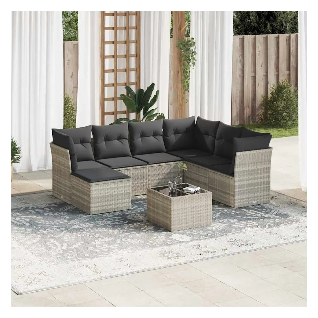 Cet ensemble de canapés de jardin est le complément parfait de votre arrière-cour, terrasse ou patio, offrant un espace confortable et accueillant pour discuter avec la famille et les amis ou simplement se détendre et profiter de l'extérieur. Matériau durable : la résine tressée, également connue sous le nom de poly rotin, est un matériau synthétique solide et nécessitant peu d'entretien qui ressemble au rotin naturel. Il est léger, facile à nettoyer et couramment utilisé pour les meubles d'extérieur en raison de sa durabilité et de ses propriétés de résistance aux intempéries.Fonction de rangement avec sac résistant à l'eau : chaque siège de jardin dispose d'un espace de rangement sous l'assise, complété par un sac résistant à l'eau pour ranger les coussins, les jouets et d'autres objets. Les sacs intérieurs sont dotés d'un couvercle et peuvent être solidement fixés aux sièges à l'aide de bandes auto-agrippantes pour plus de stabilité.Dessus en verre : le dessus de la table d'extérieur est fabriqué en verre trempé solide et durable, ce qui le rend facile à nettoyer avec un chiffon humide et ajoute une touche d'élégance à votre espace extérieur.Housse amovible et lavable : ces coussins de siège sont dotés de housses amovibles pour un lavage et un entretien faciles.Conception modulaire : cet ensemble de meubles d'extérieur a une conception modulaire, ce qui le rend complètement flexible et facile à déplacer, afin que vous puissiez créer un agencement de meubles d'extérieur personnalisé. Bon à savoir :Pour que vos meubles d'extérieur restent beaux, nous vous recommandons de les protéger avec une housse imperméable.