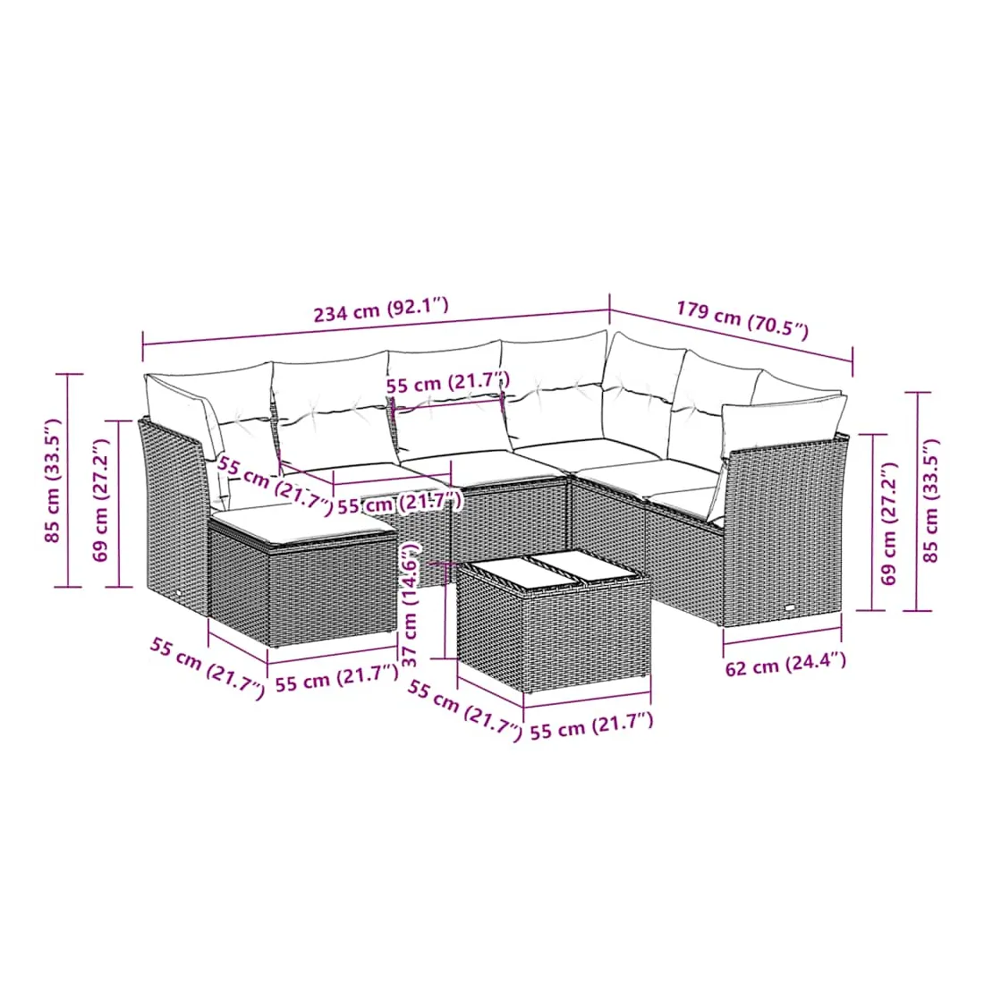 - Dimensions totales du canapé : 234 x 179 x 69 cm (l x P x H)