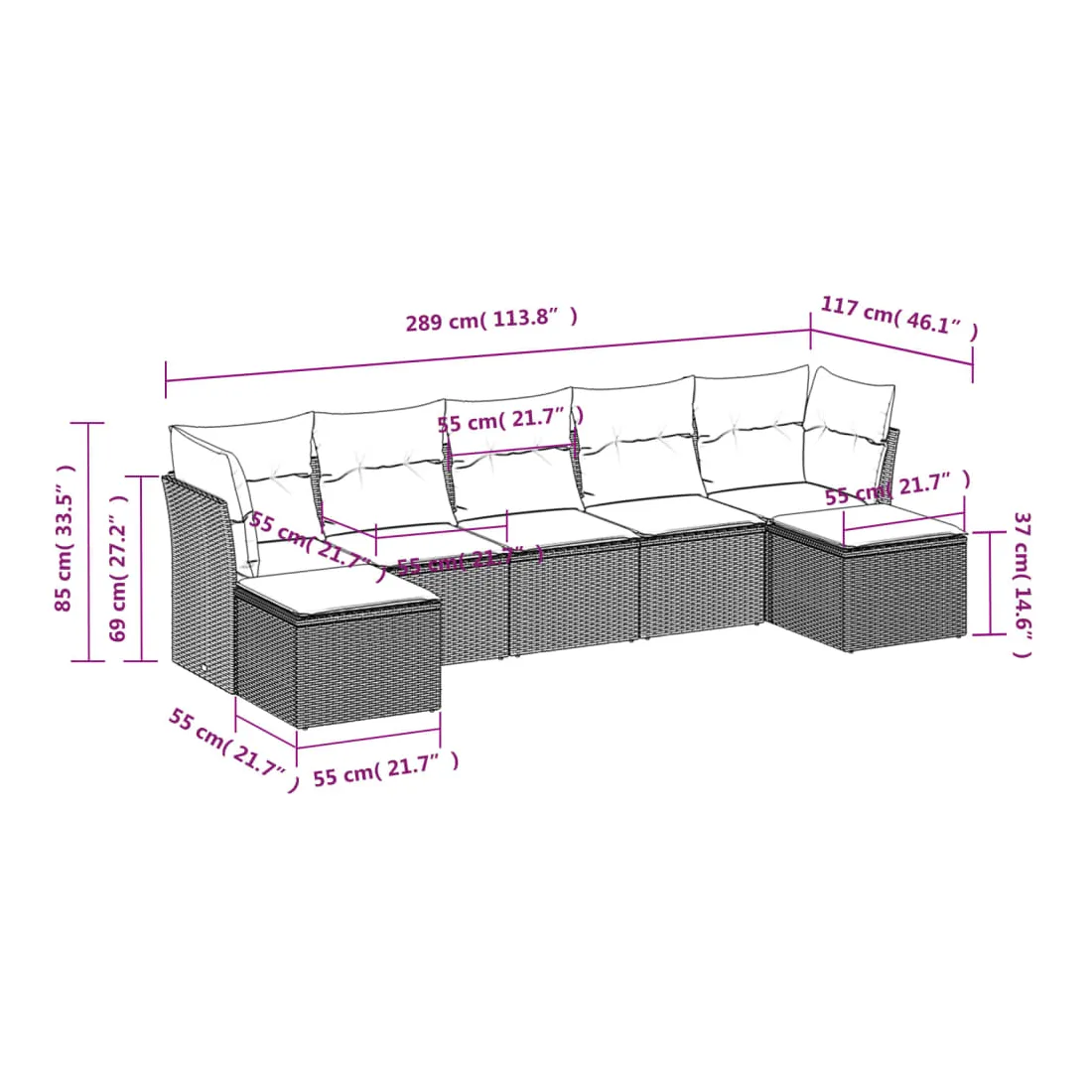 - Dimensions totales du canapé : 289 x 117 x 69 cm (l x P x H)