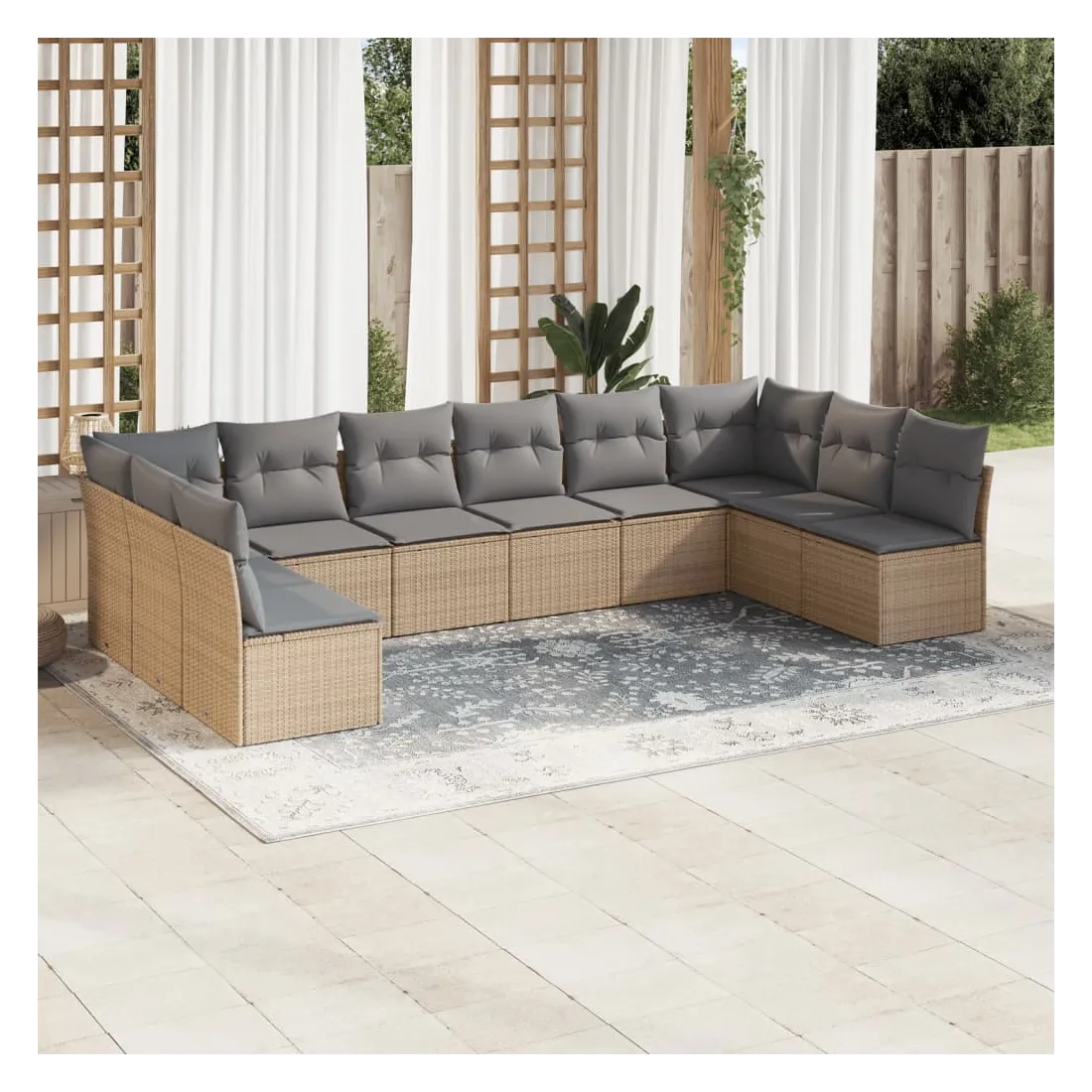 Cet ensemble de canapés de jardin est le complément parfait de votre arrière-cour, terrasse ou patio, offrant un espace confortable et accueillant pour discuter avec la famille et les amis ou simplement se détendre et profiter de l'extérieur. Matériau durable : la résine tressée, également connue sous le nom de poly rotin, est un matériau synthétique solide et nécessitant peu d'entretien qui ressemble au rotin naturel. Il est léger, facile à nettoyer et couramment utilisé pour les meubles d'extérieur en raison de sa durabilité et de ses propriétés de résistance aux intempéries.Fonction de rangement avec sac résistant à l'eau : chaque siège de jardin dispose d'un espace de rangement sous l'assise, complété par un sac résistant à l'eau pour ranger les coussins, les jouets et d'autres objets. Les sacs intérieurs sont dotés d'un couvercle et peuvent être solidement fixés aux sièges à l'aide de bandes auto-agrippantes pour plus de stabilité.Housse amovible et lavable : ces coussins de siège sont dotés de housses amovibles pour un lavage et un entretien faciles.Conception modulaire : cet ensemble de meubles d'extérieur a une conception modulaire, ce qui le rend complètement flexible et facile à déplacer, afin que vous puissiez créer un agencement de meubles d'extérieur personnalisé. Bon à savoir :Pour que vos meubles d'extérieur restent beaux, nous vous recommandons de les protéger avec une housse imperméable.