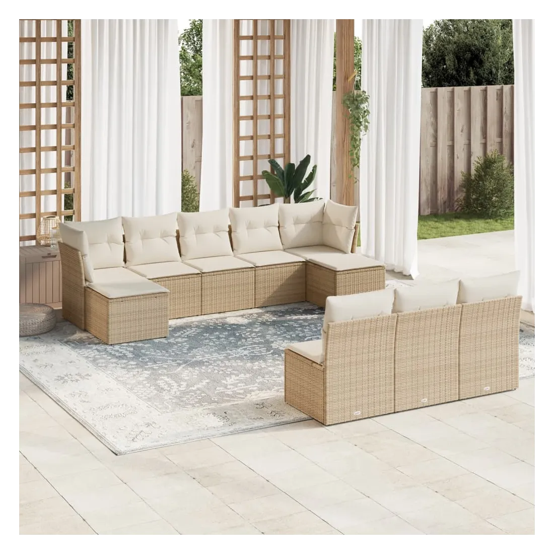 Cet ensemble de canapés de jardin est le complément parfait de votre arrière-cour, terrasse ou patio, offrant un espace confortable et accueillant pour discuter avec la famille et les amis ou simplement se détendre et profiter de l'extérieur. Matériau durable : la résine tressée, également connue sous le nom de poly rotin, est un matériau synthétique solide et nécessitant peu d'entretien qui ressemble au rotin naturel. Il est léger, facile à nettoyer et couramment utilisé pour les meubles d'extérieur en raison de sa durabilité et de ses propriétés de résistance aux intempéries.Fonction de rangement avec sac résistant à l'eau : chaque siège de jardin dispose d'un espace de rangement sous l'assise, complété par un sac résistant à l'eau pour ranger les coussins, les jouets et d'autres objets. Les sacs intérieurs sont dotés d'un couvercle et peuvent être solidement fixés aux sièges à l'aide de bandes auto-agrippantes pour plus de stabilité.Housse amovible et lavable : ces coussins de siège sont dotés de housses amovibles pour un lavage et un entretien faciles.Conception modulaire : cet ensemble de meubles d'extérieur a une conception modulaire, ce qui le rend complètement flexible et facile à déplacer, afin que vous puissiez créer un agencement de meubles d'extérieur personnalisé. Bon à savoir :Pour que vos meubles d'extérieur restent beaux, nous vous recommandons de les protéger avec une housse imperméable.