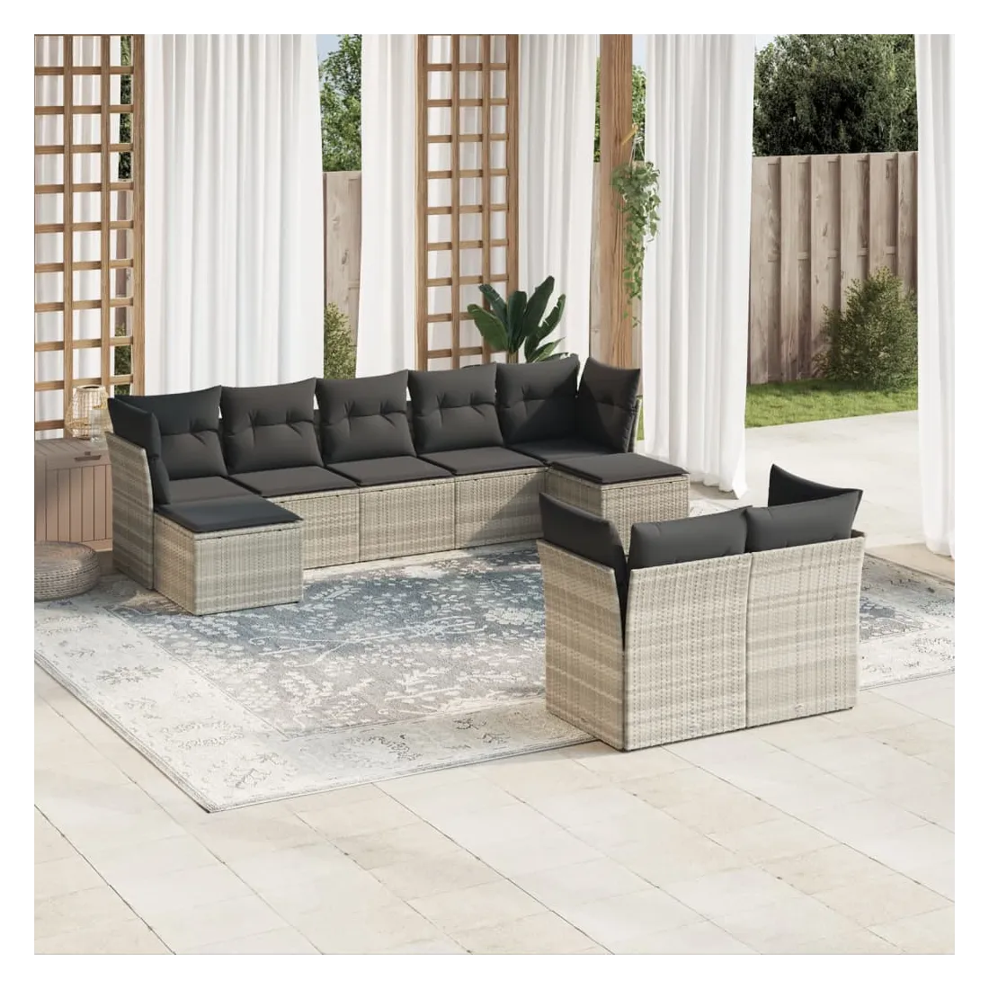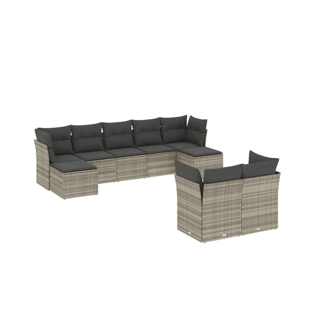 Cet ensemble de canapés de jardin est le complément parfait de votre arrière-cour, terrasse ou patio, offrant un espace confortable et accueillant pour discuter avec la famille et les amis ou simplement se détendre et profiter de l'extérieur. Matériau durable : la résine tressée, également connue sous le nom de poly rotin, est un matériau synthétique solide et nécessitant peu d'entretien qui ressemble au rotin naturel. Il est léger, facile à nettoyer et couramment utilisé pour les meubles d'extérieur en raison de sa durabilité et de ses propriétés de résistance aux intempéries.Fonction de rangement avec sac résistant à l'eau : chaque siège de jardin dispose d'un espace de rangement sous l'assise, complété par un sac résistant à l'eau pour ranger les coussins, les jouets et d'autres objets. Les sacs intérieurs sont dotés d'un couvercle et peuvent être solidement fixés aux sièges à l'aide de bandes auto-agrippantes pour plus de stabilité.Housse amovible et lavable : ces coussins de siège sont dotés de housses amovibles pour un lavage et un entretien faciles.Conception modulaire : cet ensemble de meubles d'extérieur a une conception modulaire, ce qui le rend complètement flexible et facile à déplacer, afin que vous puissiez créer un agencement de meubles d'extérieur personnalisé. Bon à savoir :Pour que vos meubles d'extérieur restent beaux, nous vous recommandons de les protéger avec une housse imperméable.