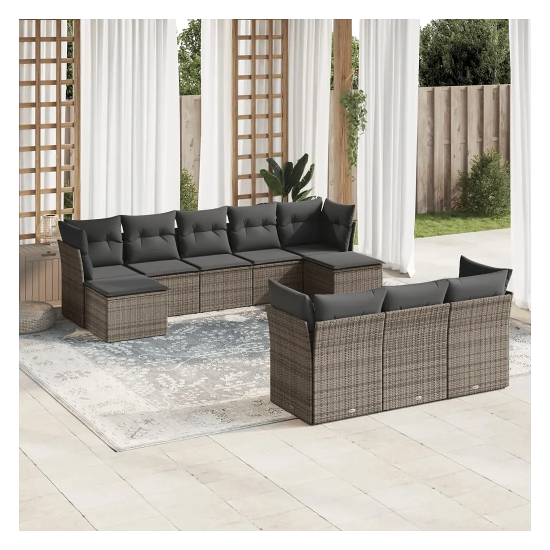 Cet ensemble de canapés de jardin est le complément parfait de votre arrière-cour, terrasse ou patio, offrant un espace confortable et accueillant pour discuter avec la famille et les amis ou simplement se détendre et profiter de l'extérieur. Matériau durable : la résine tressée, également connue sous le nom de poly rotin, est un matériau synthétique solide et nécessitant peu d'entretien qui ressemble au rotin naturel. Il est léger, facile à nettoyer et couramment utilisé pour les meubles d'extérieur en raison de sa durabilité et de ses propriétés de résistance aux intempéries.Fonction de rangement avec sac résistant à l'eau : chaque siège de jardin dispose d'un espace de rangement sous l'assise, complété par un sac résistant à l'eau pour ranger les coussins, les jouets et d'autres objets. Les sacs intérieurs sont dotés d'un couvercle et peuvent être solidement fixés aux sièges à l'aide de bandes auto-agrippantes pour plus de stabilité.Housse amovible et lavable : ces coussins de siège sont dotés de housses amovibles pour un lavage et un entretien faciles.Conception modulaire : cet ensemble de meubles d'extérieur a une conception modulaire, ce qui le rend complètement flexible et facile à déplacer, afin que vous puissiez créer un agencement de meubles d'extérieur personnalisé. Bon à savoir :Pour que vos meubles d'extérieur restent beaux, nous vous recommandons de les protéger avec une housse imperméable.