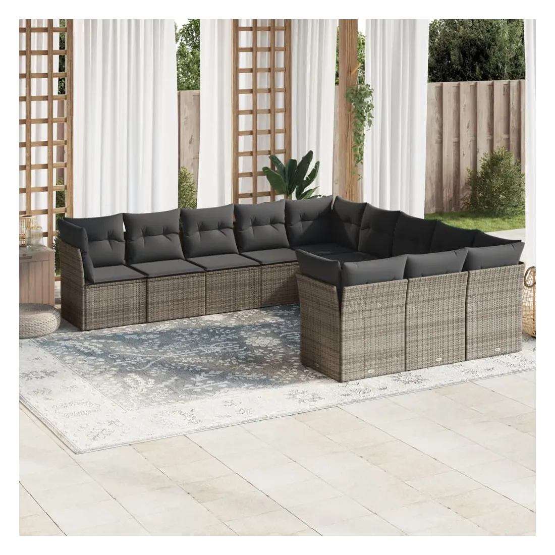 Cet ensemble de canapés de jardin est le complément parfait de votre arrière-cour, terrasse ou patio, offrant un espace confortable et accueillant pour discuter avec la famille et les amis ou simplement se détendre et profiter de l'extérieur. Matériau durable : la résine tressée, également connue sous le nom de poly rotin, est un matériau synthétique solide et nécessitant peu d'entretien qui ressemble au rotin naturel. Il est léger, facile à nettoyer et couramment utilisé pour les meubles d'extérieur en raison de sa durabilité et de ses propriétés de résistance aux intempéries.Fonction de rangement avec sac résistant à l'eau : chaque siège de jardin dispose d'un espace de rangement sous l'assise, complété par un sac résistant à l'eau pour ranger les coussins, les jouets et d'autres objets. Les sacs intérieurs sont dotés d'un couvercle et peuvent être solidement fixés aux sièges à l'aide de bandes auto-agrippantes pour plus de stabilité.Housse amovible et lavable : ces coussins de siège sont dotés de housses amovibles pour un lavage et un entretien faciles.Conception modulaire : cet ensemble de meubles d'extérieur a une conception modulaire, ce qui le rend complètement flexible et facile à déplacer, afin que vous puissiez créer un agencement de meubles d'extérieur personnalisé. Bon à savoir :Pour que vos meubles d'extérieur restent beaux, nous vous recommandons de les protéger avec une housse imperméable.