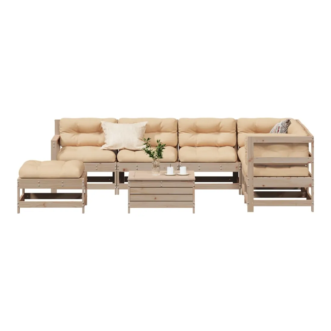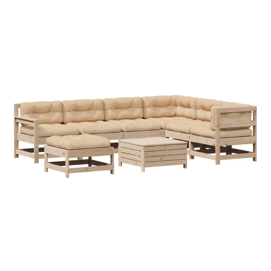 Cet ensemble de salon de jardin en bois avec un design à lattes sera un excellent complément à votre jardin, patio ou terrasse pour profiter d'un moment agréable avec votre famille ou vos amis. Bois de pin massif : le bois de pin massif est un matériau naturel magnifique. Le bois de pin a un grain droit et les nœuds donnent au matériau son aspect caractéristique et rustique.Design à lattes : le design à lattes de la chaise de jardin en bois empêche l'accumulation de l'eau, ce qui permet de garder le siège au sec et d'éviter un pourrissement inutile.Expérience d'assise confortable : le dossier et l'accoudoir ajoutent un confort d'assise supplémentaire à l'ensemble de meubles de jardin. De plus, le coussin bien rembourré vous permet de vous asseoir confortablement.Utilisation polyvalente : le pouf d'extérieur avec couvercle peut non seulement être utilisé pour s'asseoir ou se détendre, mais il peut également être utilisé comme table basse pour contenir vos boissons, votre nourriture et le meuble de jardin dispose d'un espace de rangement sous le siège. Conception modulaire : cet ensemble de meubles d'extérieur a une conception modulaire, ce qui le rend complètement flexible et facile à déplacer, afin que vous puissiez créer un agencement de meubles d'extérieur personnalisé. Bon à savoir :Pour que vos meubles d'extérieur restent beaux, nous vous recommandons de les protéger avec une housse imperméable.