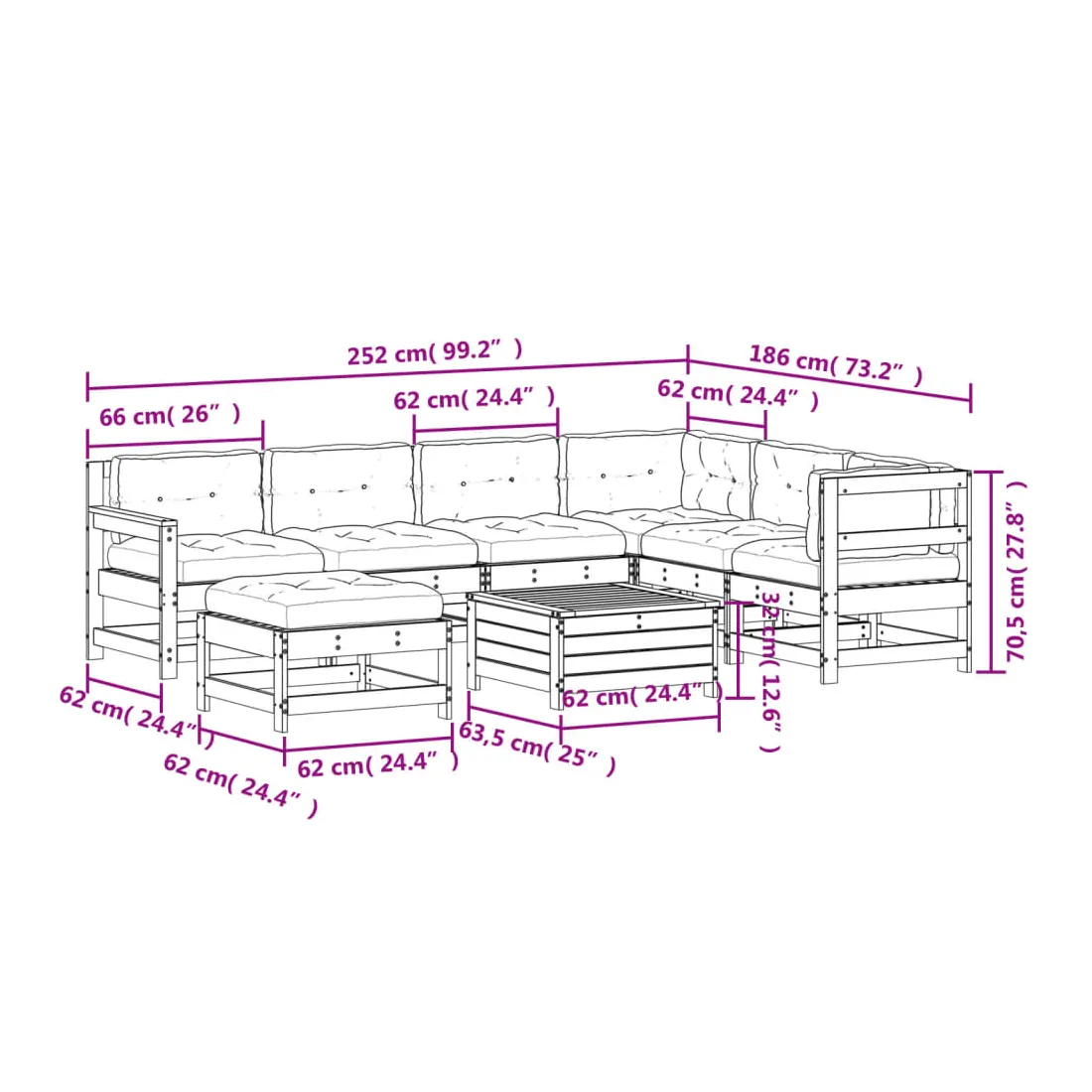 - Dimensions du canapé d'angle de jardin : 62 x 62 x 70,5 cm (l x P x H)