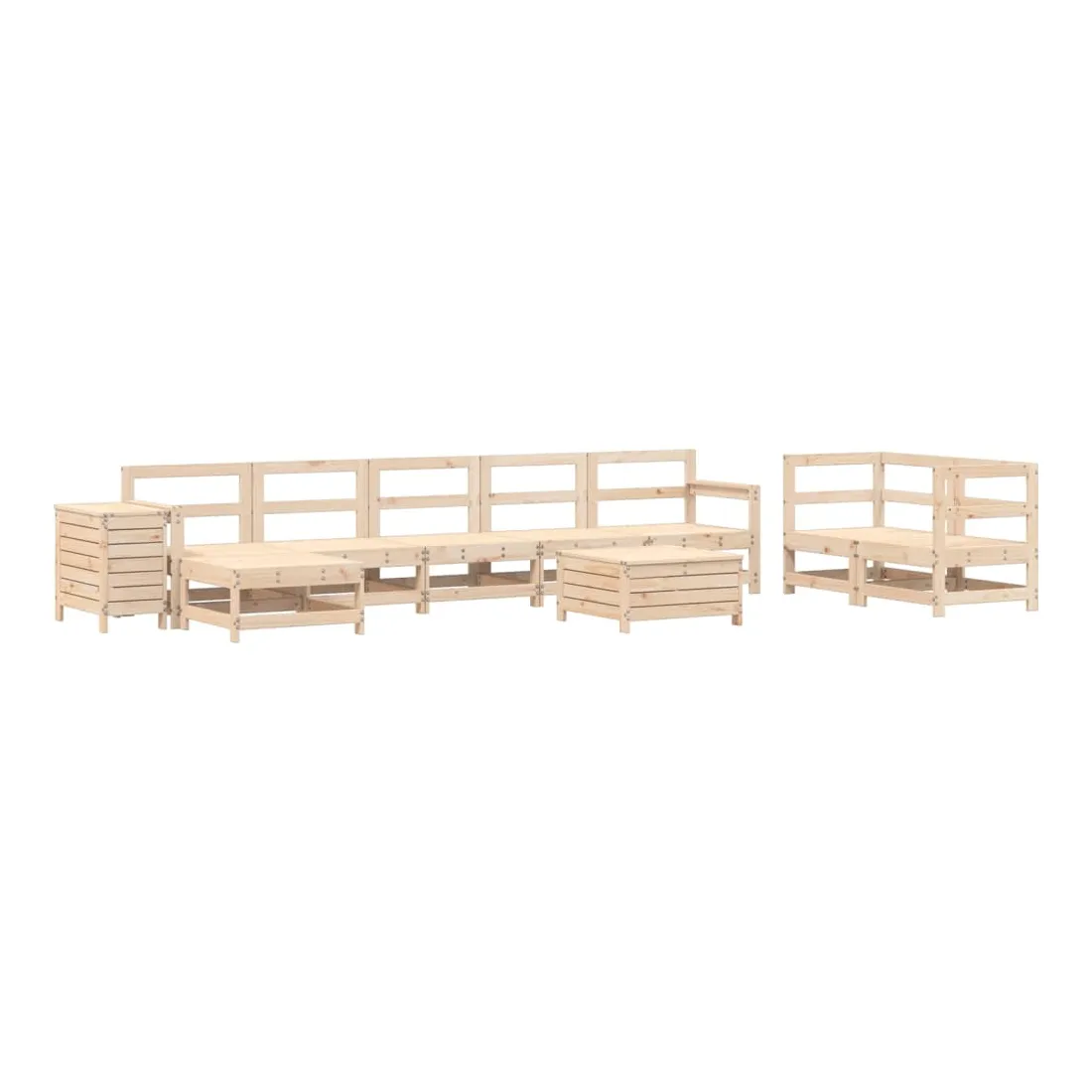 vidaXLCet ensemble de salon de jardin en bois avec un design à lattes sera un excellent complément à votre jardin, patio ou terrasse pour profiter d'un moment agréable avec votre famille ou vos amis. Matériau robuste et durable : le bois de pin massif est connu pour sa résistance et sa durabilité. Ses grains droits et ses nœuds distinctifs contribuent à son charme rustique. Bien ventilé et prévention de l'accumulation d'eau : la conception à lattes favorise une circulation optimale de l'air et empêche efficacement l'accumulation d'eau, assurant ainsi une assise sèche et confortable. Utilisation polyvalente : le repose-pied de jardin peut non seulement être utilisé pour s'asseoir ou se détendre, mais il peut également être utilisé comme table basse pour contenir vos boissons, votre nourriture et d'autres décorations. Table pratique : la table de jardin vous offre un endroit pratique pour atteindre facilement vos essentiels. Conception modulaire : cet ensemble de meubles d'extérieur a une conception modulaire, ce qui le rend complètement flexible et facile à déplacer, afin que vous puissiez créer un agencement de meubles d'extérieur personnalisé. Bon à savoir :Pour que vos meubles d'extérieur restent beaux, nous vous recommandons de les protéger avec une housse imperméable.