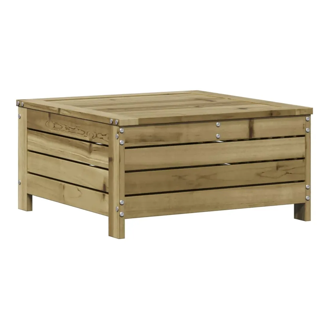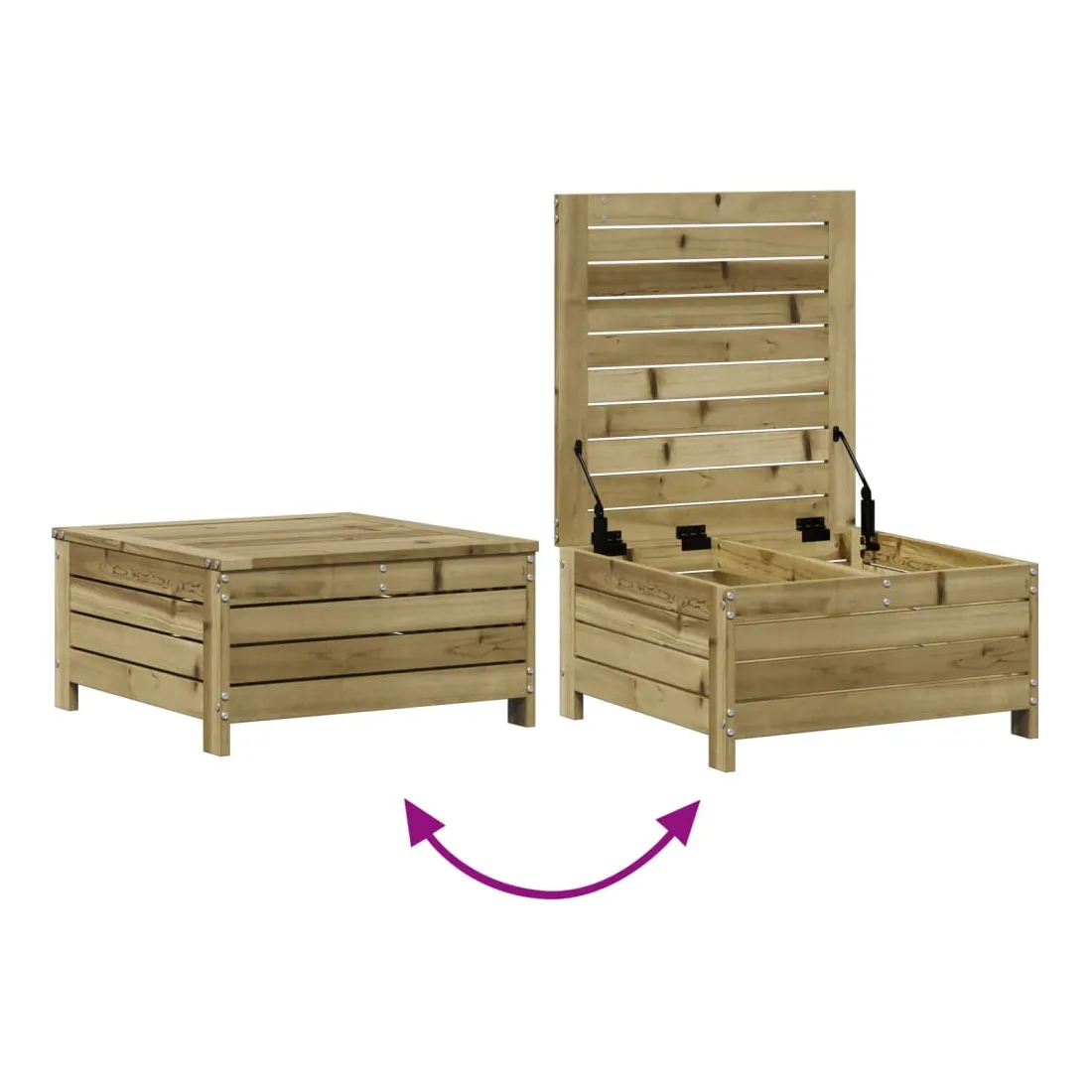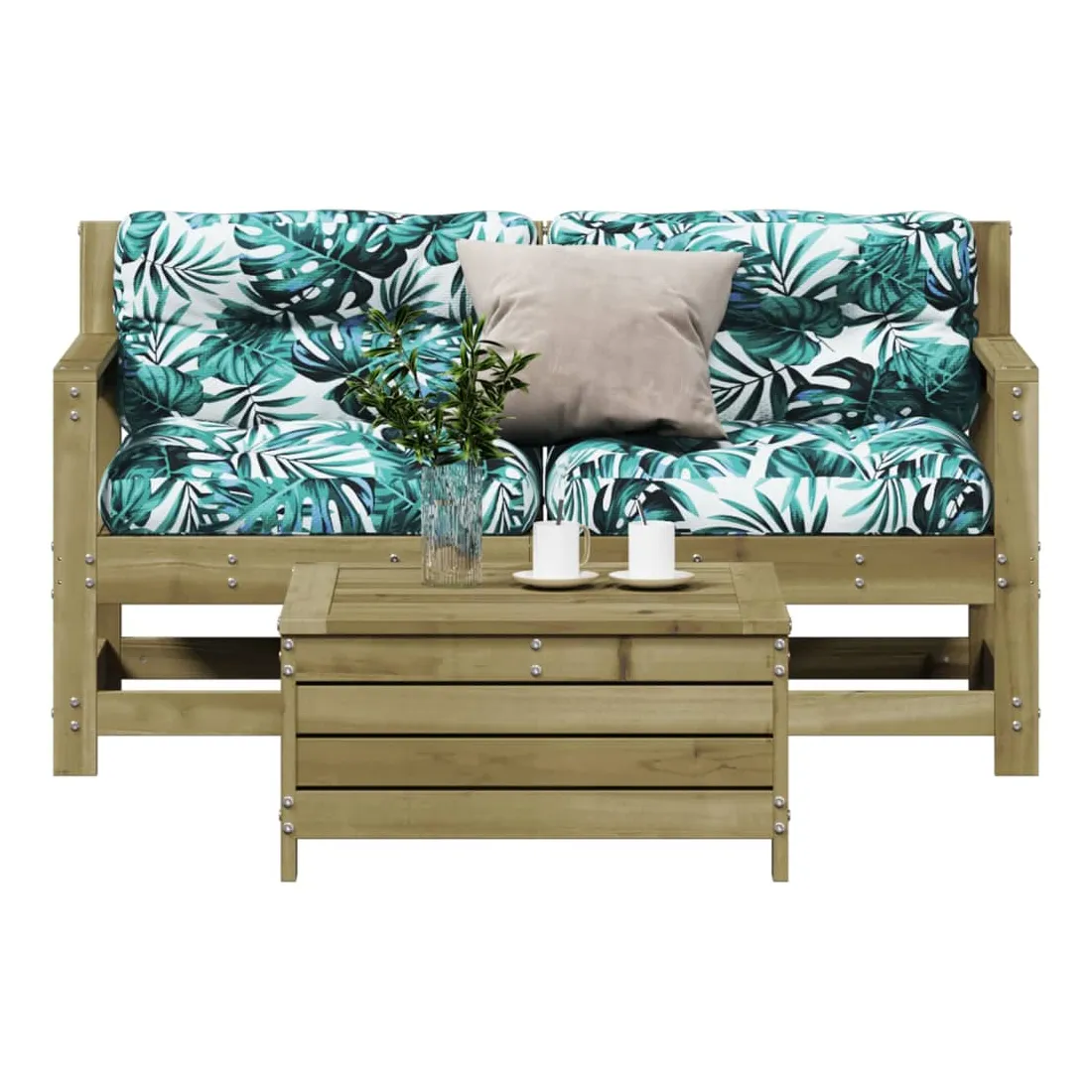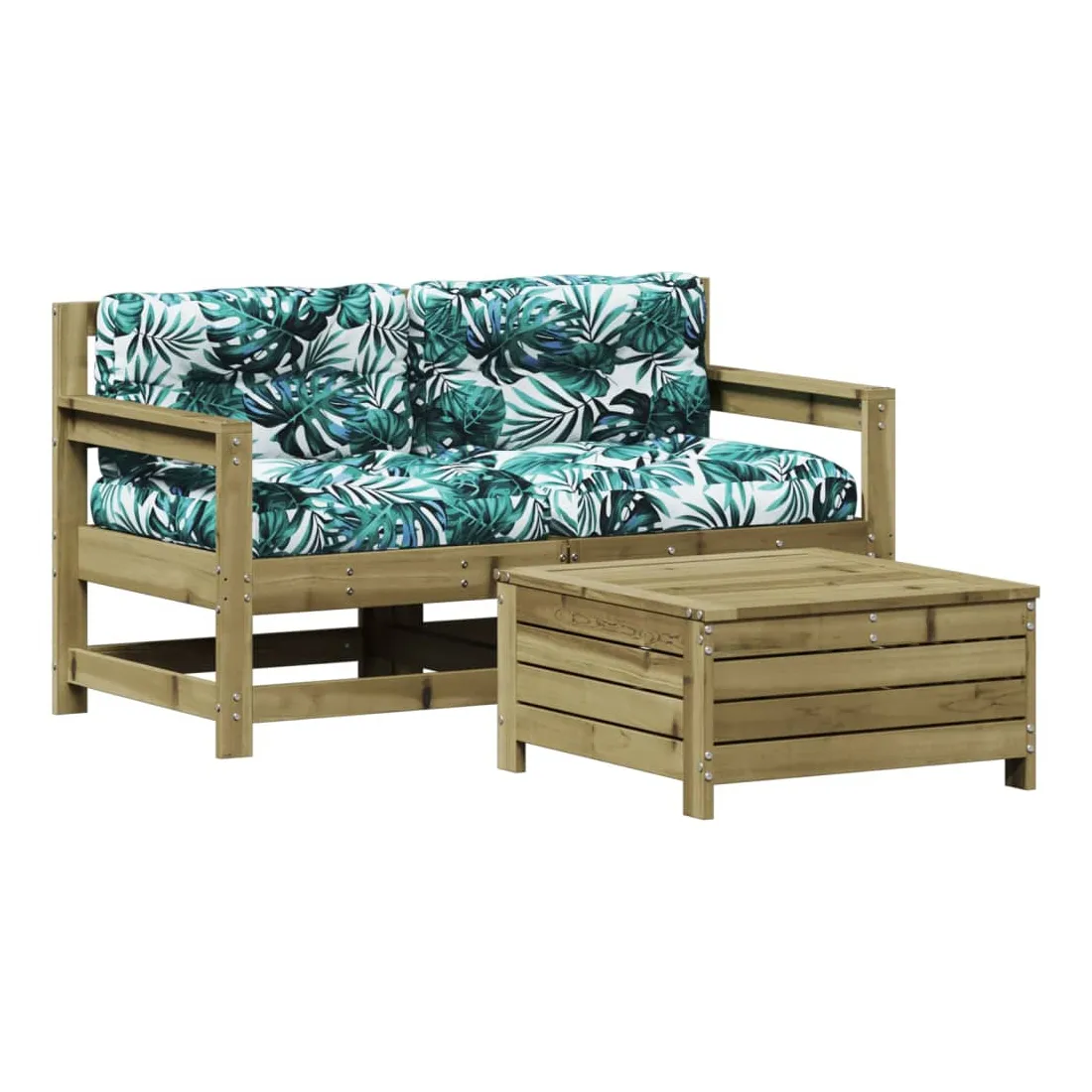 Cet ensemble de salon de jardin en bois avec un design à lattes sera un excellent complément à votre jardin, patio ou terrasse pour profiter d'un moment agréable avec votre famille ou vos amis. Bois imprégné : le bois de pin massif est un matériau naturel magnifique. Le bois de pin a un grain droit et les nœuds lui confèrent un aspect rustique caractéristique. L'imprégnation est un processus de conservation réalisé à l'aide d'autoclaves. Le traitement sous pression augmente la résistance à la pourriture et aux intempéries.Design à lattes : le design à lattes de la chaise de jardin en bois empêche l'accumulation de l'eau, ce qui permet de garder le siège au sec et d'éviter un pourrissement inutile.Expérience d'assise confortable : le dossier et l'accoudoir ajoutent un confort d'assise supplémentaire à l'ensemble de meubles de jardin. De plus, le coussin bien rembourré vous permet de vous asseoir confortablement.Utilisation polyvalente : le pouf d'extérieur avec couvercle peut non seulement être utilisé pour s'asseoir ou se détendre, mais il peut également être utilisé comme table basse pour contenir vos boissons, votre nourriture et le meuble de jardin dispose d'un espace de rangement sous le siège. Conception modulaire : cet ensemble de meubles d'extérieur a une conception modulaire, ce qui le rend complètement flexible et facile à déplacer, afin que vous puissiez créer un agencement de meubles d'extérieur personnalisé. Bon à savoir :Pour que vos meubles d'extérieur restent beaux, nous vous recommandons de les protéger avec une housse imperméable.