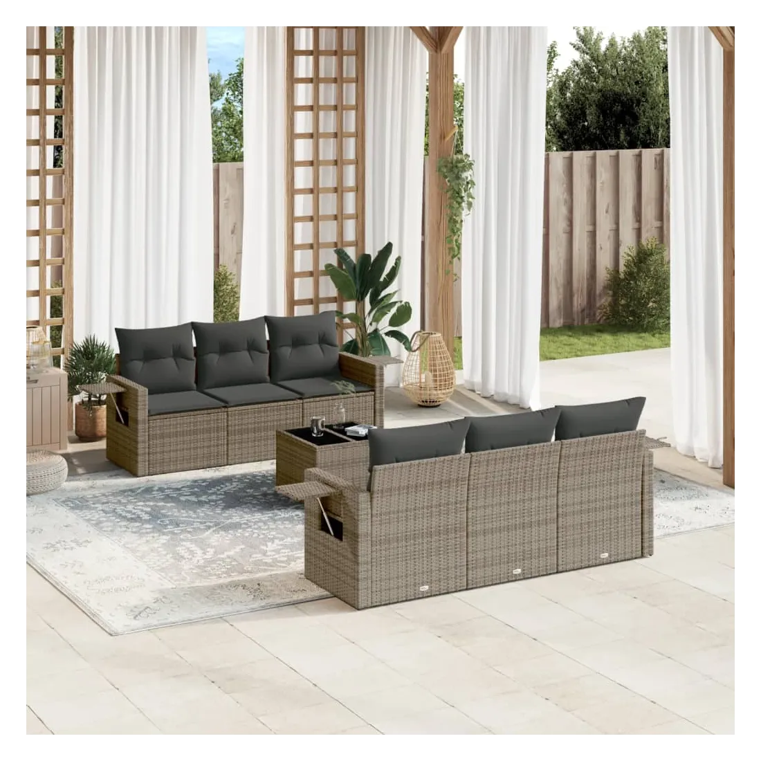Cet ensemble de canapés de jardin est le complément parfait de votre arrière-cour, terrasse ou patio, offrant un espace confortable et accueillant pour discuter avec la famille et les amis ou simplement se détendre et profiter de l'extérieur. Matériau durable : la résine tressée, également connue sous le nom de poly rotin, est un matériau synthétique solide et nécessitant peu d'entretien qui ressemble au rotin naturel. Il est léger, facile à nettoyer et couramment utilisé pour les meubles d'extérieur en raison de sa durabilité et de ses propriétés de résistance aux intempéries.Fonction de rangement avec sac résistant à l'eau : le mobilier de jardin dispose d'un espace de rangement sous l'assise, complété par un sac résistant à l'eau pour ranger coussins, jouets et autres objets. Le sac intérieur peut être solidement fixé au mobilier d'extérieur grâce à des attaches auto-agrippantes pour plus de stabilité.Table d'appoint pratique : ce mobilier d'extérieur comprend une table d'appoint pliable avec un ressort à gaz sur les accoudoirs, offrant un endroit pratique pour garder vos essentiels à portée de main.Housse amovible et lavable : ces coussins de siège sont dotés de housses amovibles pour un lavage et un entretien faciles.Conception modulaire : cet ensemble de meubles d'extérieur a une conception modulaire, ce qui le rend complètement flexible et facile à déplacer, afin que vous puissiez créer un agencement de meubles d'extérieur personnalisé. Bon à savoir :Pour que vos meubles d'extérieur restent beaux, nous vous recommandons de les protéger avec une housse imperméable.