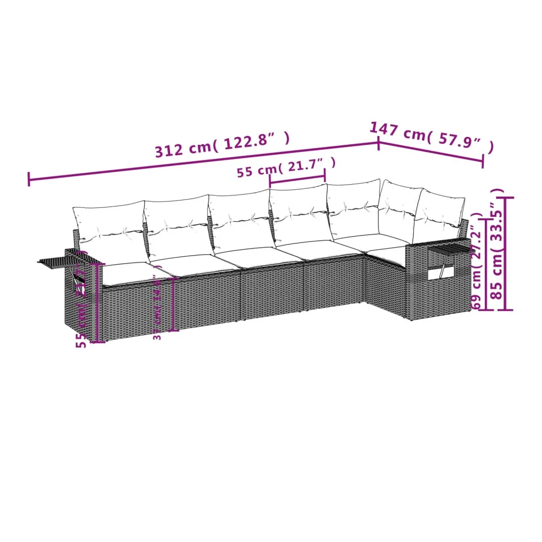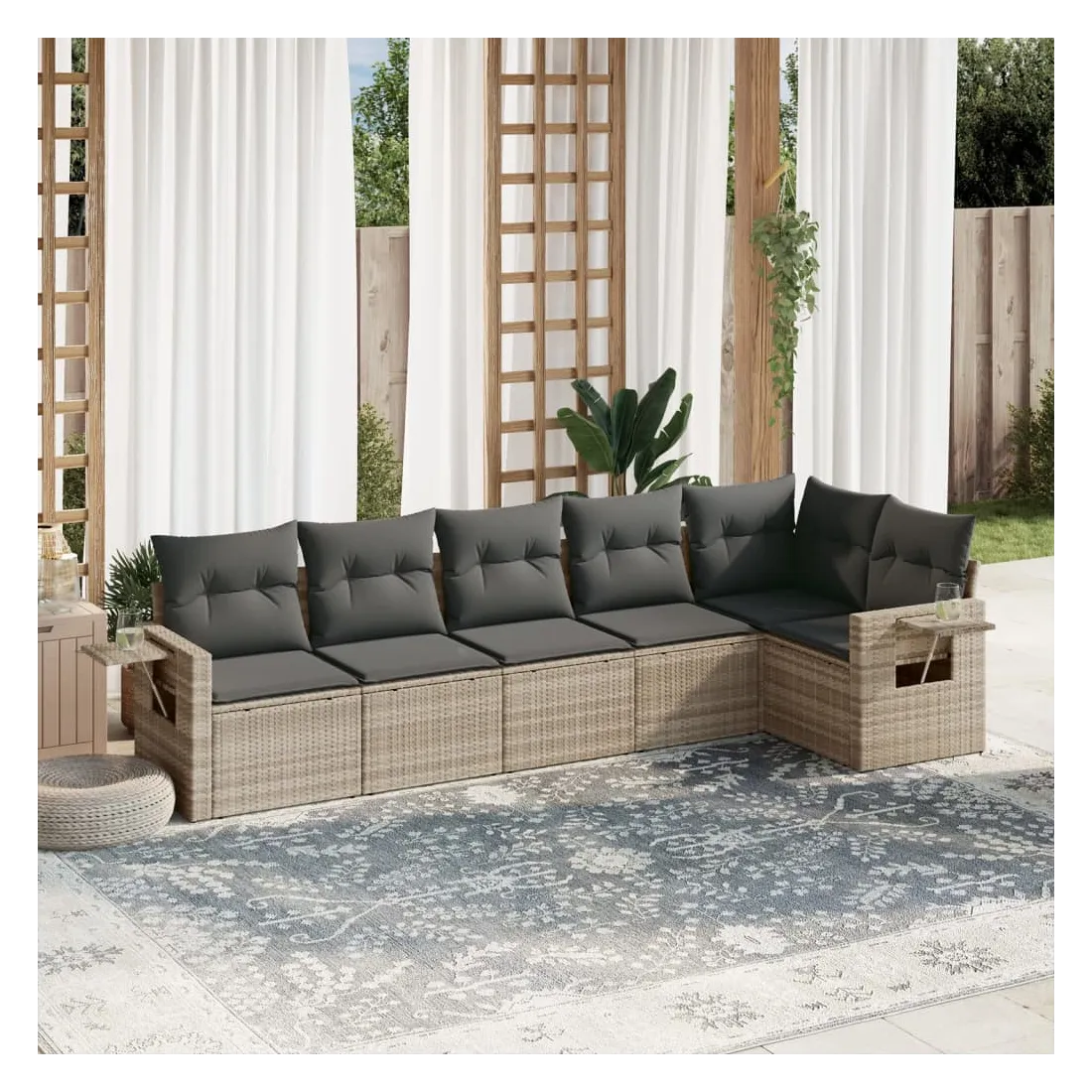 Cet ensemble de canapés de jardin est le complément parfait de votre arrière-cour, terrasse ou patio, offrant un espace confortable et accueillant pour discuter avec la famille et les amis ou simplement se détendre et profiter de l'extérieur. Matériau durable : la résine tressée, également connue sous le nom de poly rotin, est un matériau synthétique solide et nécessitant peu d'entretien qui ressemble au rotin naturel. Il est léger, facile à nettoyer et couramment utilisé pour les meubles d'extérieur en raison de sa durabilité et de ses propriétés de résistance aux intempéries.Fonction de rangement avec sac résistant à l'eau : le mobilier de jardin dispose d'un espace de rangement sous l'assise, complété par un sac résistant à l'eau pour ranger coussins, jouets et autres objets. Le sac intérieur peut être solidement fixé au mobilier d'extérieur grâce à des attaches auto-agrippantes pour plus de stabilité.Table d'appoint pratique : ce mobilier d'extérieur comprend une table d'appoint pliable avec un ressort à gaz sur les accoudoirs, offrant un endroit pratique pour garder vos essentiels à portée de main.Housse amovible et lavable : ces coussins de siège sont dotés de housses amovibles pour un lavage et un entretien faciles.Conception modulaire : cet ensemble de meubles d'extérieur a une conception modulaire, ce qui le rend complètement flexible et facile à déplacer, afin que vous puissiez créer un agencement de meubles d'extérieur personnalisé. Bon à savoir :Pour que vos meubles d'extérieur restent beaux, nous vous recommandons de les protéger avec une housse imperméable.