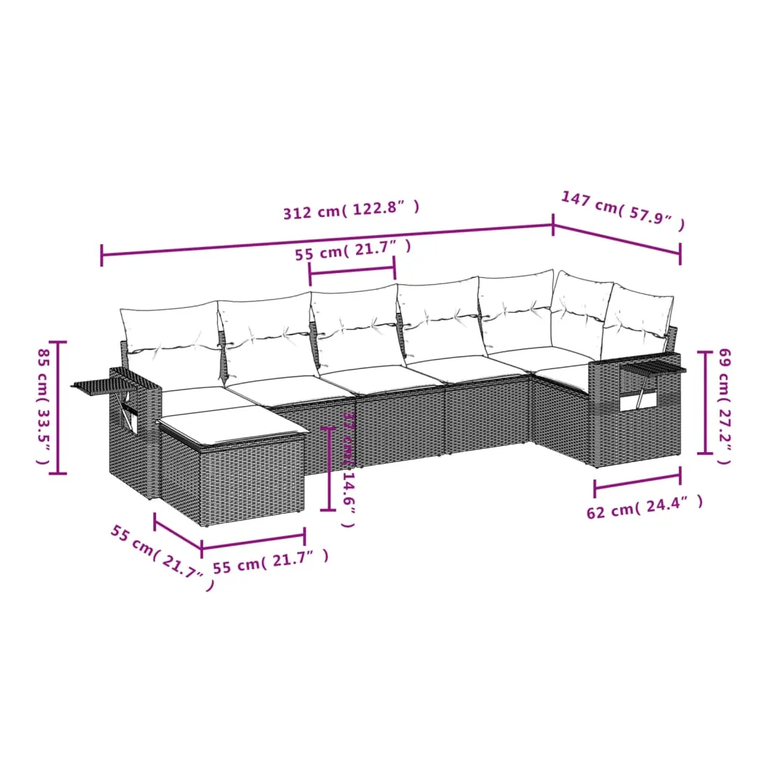Cet ensemble de canapés de jardin est le complément parfait de votre arrière-cour, terrasse ou patio, offrant un espace confortable et accueillant pour discuter avec la famille et les amis ou simplement se détendre et profiter de l'extérieur. Matériau durable : la résine tressée, également connue sous le nom de poly rotin, est un matériau synthétique solide et nécessitant peu d'entretien qui ressemble au rotin naturel. Il est léger, facile à nettoyer et couramment utilisé pour les meubles d'extérieur en raison de sa durabilité et de ses propriétés de résistance aux intempéries.Fonction de rangement avec sac résistant à l'eau : le mobilier de jardin dispose d'un espace de rangement sous l'assise, complété par un sac résistant à l'eau pour ranger coussins, jouets et autres objets. Le sac intérieur peut être solidement fixé au mobilier d'extérieur grâce à des attaches auto-agrippantes pour plus de stabilité.Table d'appoint pratique : ce mobilier d'extérieur comprend une table d'appoint pliable avec un ressort à gaz sur les accoudoirs, offrant un endroit pratique pour garder vos essentiels à portée de main.Housse amovible et lavable : ces coussins de siège sont dotés de housses amovibles pour un lavage et un entretien faciles.Conception modulaire : cet ensemble de meubles d'extérieur a une conception modulaire, ce qui le rend complètement flexible et facile à déplacer, afin que vous puissiez créer un agencement de meubles d'extérieur personnalisé. Bon à savoir :Pour que vos meubles d'extérieur restent beaux, nous vous recommandons de les protéger avec une housse imperméable.