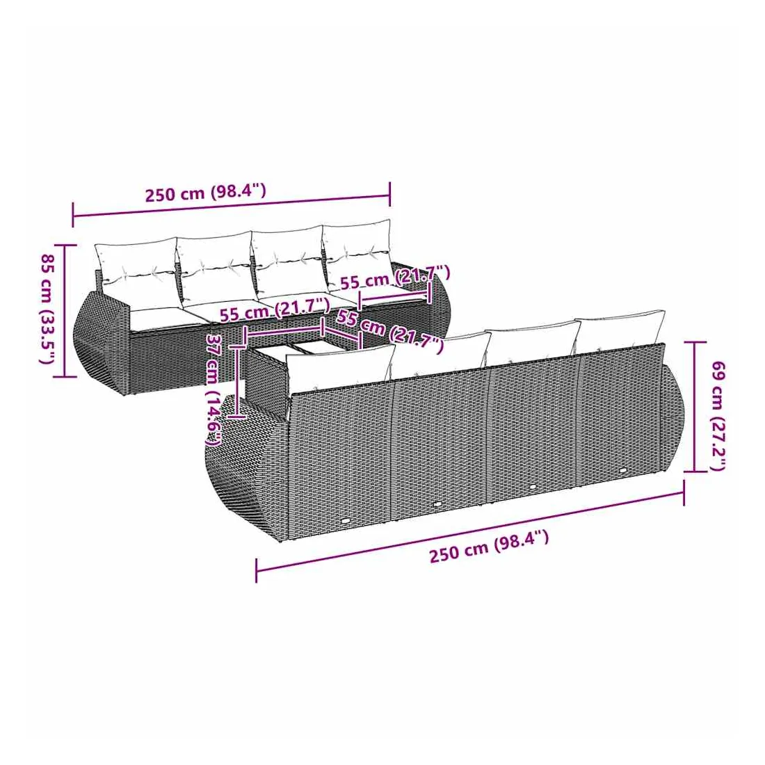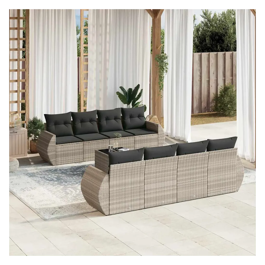 Cet ensemble de canapés de jardin est le complément parfait de votre arrière-cour, terrasse ou patio, offrant un espace confortable et accueillant pour discuter avec la famille et les amis ou simplement se détendre et profiter de l'extérieur. Matériau durable : la résine tressée, également connue sous le nom de poly rotin, est un matériau synthétique solide et nécessitant peu d'entretien qui ressemble au rotin naturel. Il est léger, facile à nettoyer et couramment utilisé pour les meubles d'extérieur en raison de sa durabilité et de ses propriétés de résistance aux intempéries.Fonction de rangement avec sac résistant à l'eau : chaque siège de jardin dispose d'un espace de rangement sous l'assise, complété par un sac résistant à l'eau pour ranger les coussins, les jouets et d'autres objets. Les sacs intérieurs sont dotés d'un couvercle et peuvent être solidement fixés aux sièges à l'aide de bandes auto-agrippantes pour plus de stabilité.Dessus en verre : le dessus de la table d'extérieur est fabriqué en verre trempé solide et durable, ce qui le rend facile à nettoyer avec un chiffon humide et ajoute une touche d'élégance à votre espace extérieur.Housse amovible et lavable : ces coussins de siège sont dotés de housses amovibles pour un lavage et un entretien faciles.Conception modulaire : cet ensemble de meubles d'extérieur a une conception modulaire, ce qui le rend complètement flexible et facile à déplacer, afin que vous puissiez créer un agencement de meubles d'extérieur personnalisé. Bon à savoir :Pour que vos meubles d'extérieur restent beaux, nous vous recommandons de les protéger avec une housse imperméable.