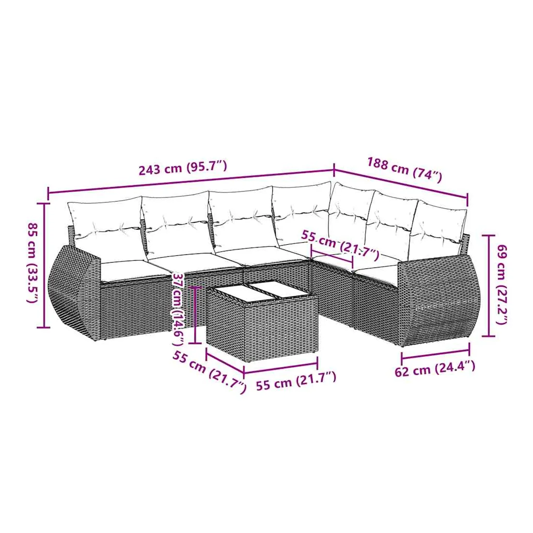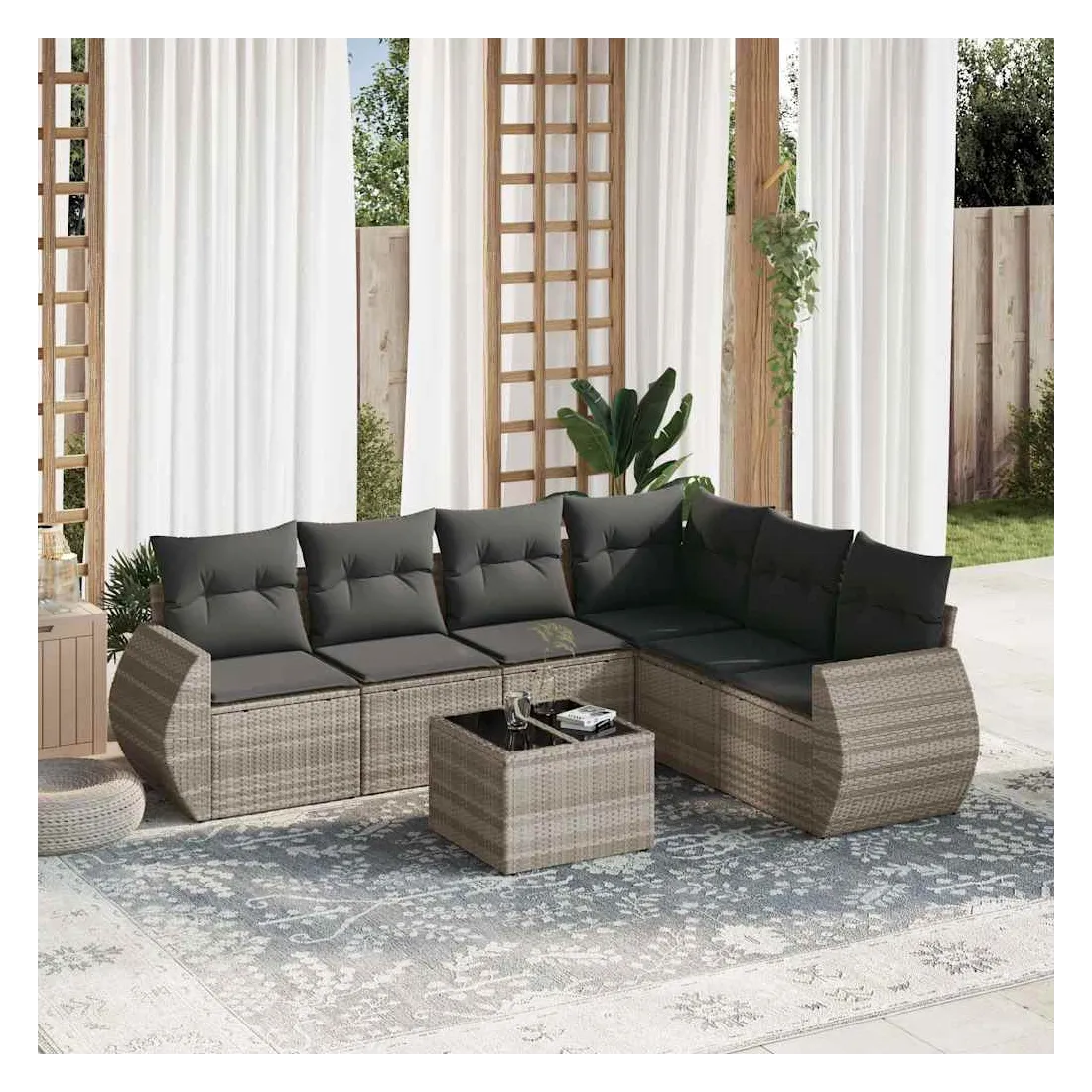 Cet ensemble de canapés de jardin est le complément parfait de votre arrière-cour, terrasse ou patio, offrant un espace confortable et accueillant pour discuter avec la famille et les amis ou simplement se détendre et profiter de l'extérieur. Matériau durable : la résine tressée, également connue sous le nom de poly rotin, est un matériau synthétique solide et nécessitant peu d'entretien qui ressemble au rotin naturel. Il est léger, facile à nettoyer et couramment utilisé pour les meubles d'extérieur en raison de sa durabilité et de ses propriétés de résistance aux intempéries.Fonction de rangement avec sac résistant à l'eau : chaque siège de jardin dispose d'un espace de rangement sous l'assise, complété par un sac résistant à l'eau pour ranger les coussins, les jouets et d'autres objets. Les sacs intérieurs sont dotés d'un couvercle et peuvent être solidement fixés aux sièges à l'aide de bandes auto-agrippantes pour plus de stabilité.Dessus en verre : le dessus de la table d'extérieur est fabriqué en verre trempé solide et durable, ce qui le rend facile à nettoyer avec un chiffon humide et ajoute une touche d'élégance à votre espace extérieur.Housse amovible et lavable : ces coussins de siège sont dotés de housses amovibles pour un lavage et un entretien faciles.Conception modulaire : cet ensemble de meubles d'extérieur a une conception modulaire, ce qui le rend complètement flexible et facile à déplacer, afin que vous puissiez créer un agencement de meubles d'extérieur personnalisé. Bon à savoir :Pour que vos meubles d'extérieur restent beaux, nous vous recommandons de les protéger avec une housse imperméable.