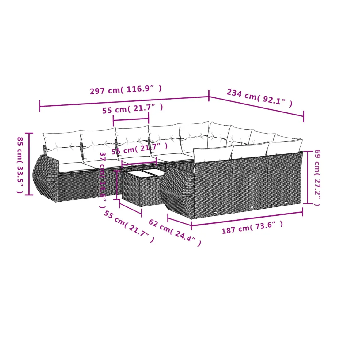 • Dimensions du coussin de dossier : 55 x 45 x 13 cm (L x l x é)