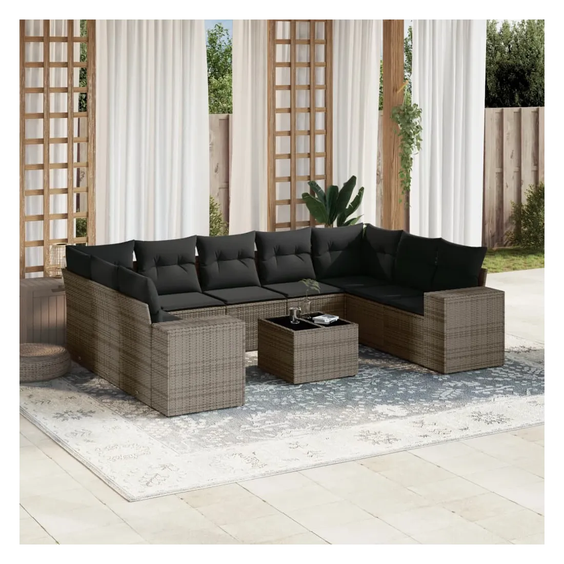 Cet ensemble de canapés de jardin est le complément parfait de votre arrière-cour, terrasse ou patio, offrant un espace confortable et accueillant pour discuter avec la famille et les amis ou simplement se détendre et profiter de l'extérieur. Matériau durable : la résine tressée, également connue sous le nom de poly rotin, est un matériau synthétique solide et nécessitant peu d'entretien qui ressemble au rotin naturel. Il est léger, facile à nettoyer et couramment utilisé pour les meubles d'extérieur en raison de sa durabilité et de ses propriétés de résistance aux intempéries.Fonction de rangement avec sac résistant à l'eau : le mobilier de jardin dispose d'un espace de rangement sous l'assise, complété par un sac résistant à l'eau pour ranger coussins, jouets et autres objets. Le sac intérieur peut être solidement fixé au mobilier d'extérieur grâce à des attaches auto-agrippantes pour plus de stabilité.Dessus en verre : le dessus de la table d'extérieur est fabriqué en verre trempé solide et durable, ce qui le rend facile à nettoyer avec un chiffon humide et ajoute une touche d'élégance à votre espace extérieur.Housse amovible et lavable : ces coussins de siège sont dotés de housses amovibles pour un lavage et un entretien faciles.Conception modulaire : cet ensemble de meubles d'extérieur a une conception modulaire, ce qui le rend complètement flexible et facile à déplacer, afin que vous puissiez créer un agencement de meubles d'extérieur personnalisé. Bon à savoir :Pour que vos meubles d'extérieur restent beaux, nous vous recommandons de les protéger avec une housse imperméable.