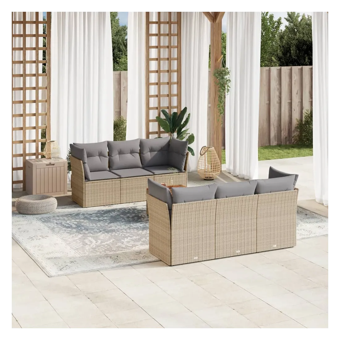 Cet ensemble de canapés de jardin est le complément parfait de votre arrière-cour, terrasse ou patio, offrant un espace confortable et accueillant pour discuter avec la famille et les amis ou simplement se détendre et profiter de l'extérieur. Matériau durable : la résine tressée, également connue sous le nom de poly rotin, est un matériau synthétique solide et nécessitant peu d'entretien qui ressemble au rotin naturel. Il est léger, facile à nettoyer et couramment utilisé pour les meubles d'extérieur en raison de sa durabilité et de ses propriétés de résistance aux intempéries.Fonction de rangement avec sac résistant à l'eau : chaque siège de jardin dispose d'un espace de rangement sous l'assise, complété par un sac résistant à l'eau pour ranger les coussins, les jouets et d'autres objets. Les sacs intérieurs sont dotés d'un couvercle et peuvent être solidement fixés aux sièges à l'aide de bandes auto-agrippantes pour plus de stabilité.Dessus stable et facile à nettoyer : cette table de jardin a un dessus en bois d'acacia robuste, durable et facile à nettoyer avec un chiffon humide.Housse amovible et lavable : ces coussins de siège sont dotés de housses amovibles pour un lavage et un entretien faciles.Conception modulaire : cet ensemble de meubles d'extérieur a une conception modulaire, ce qui le rend complètement flexible et facile à déplacer, afin que vous puissiez créer un agencement de meubles d'extérieur personnalisé. Bon à savoir :Pour que vos meubles d'extérieur restent beaux, nous vous recommandons de les protéger avec une housse imperméable.