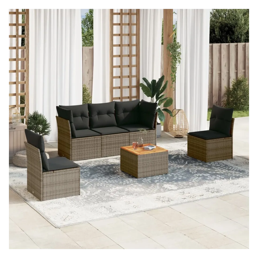 Cet ensemble de canapés de jardin est le complément parfait de votre arrière-cour, terrasse ou patio, offrant un espace confortable et accueillant pour discuter avec la famille et les amis ou simplement se détendre et profiter de l'extérieur. Matériau durable : la résine tressée, également connue sous le nom de poly rotin, est un matériau synthétique solide et nécessitant peu d'entretien qui ressemble au rotin naturel. Il est léger, facile à nettoyer et couramment utilisé pour les meubles d'extérieur en raison de sa durabilité et de ses propriétés de résistance aux intempéries.Fonction de rangement avec sac résistant à l'eau : chaque siège de jardin dispose d'un espace de rangement sous l'assise, complété par un sac résistant à l'eau pour ranger les coussins, les jouets et d'autres objets. Les sacs intérieurs sont dotés d'un couvercle et peuvent être solidement fixés aux sièges à l'aide de bandes auto-agrippantes pour plus de stabilité.Dessus stable et facile à nettoyer : cette table de jardin a un dessus en bois d'acacia robuste, durable et facile à nettoyer avec un chiffon humide.Housse amovible et lavable : ces coussins de siège sont dotés de housses amovibles pour un lavage et un entretien faciles.Conception modulaire : cet ensemble de meubles d'extérieur a une conception modulaire, ce qui le rend complètement flexible et facile à déplacer, afin que vous puissiez créer un agencement de meubles d'extérieur personnalisé. Bon à savoir :Pour que vos meubles d'extérieur restent beaux, nous vous recommandons de les protéger avec une housse imperméable.