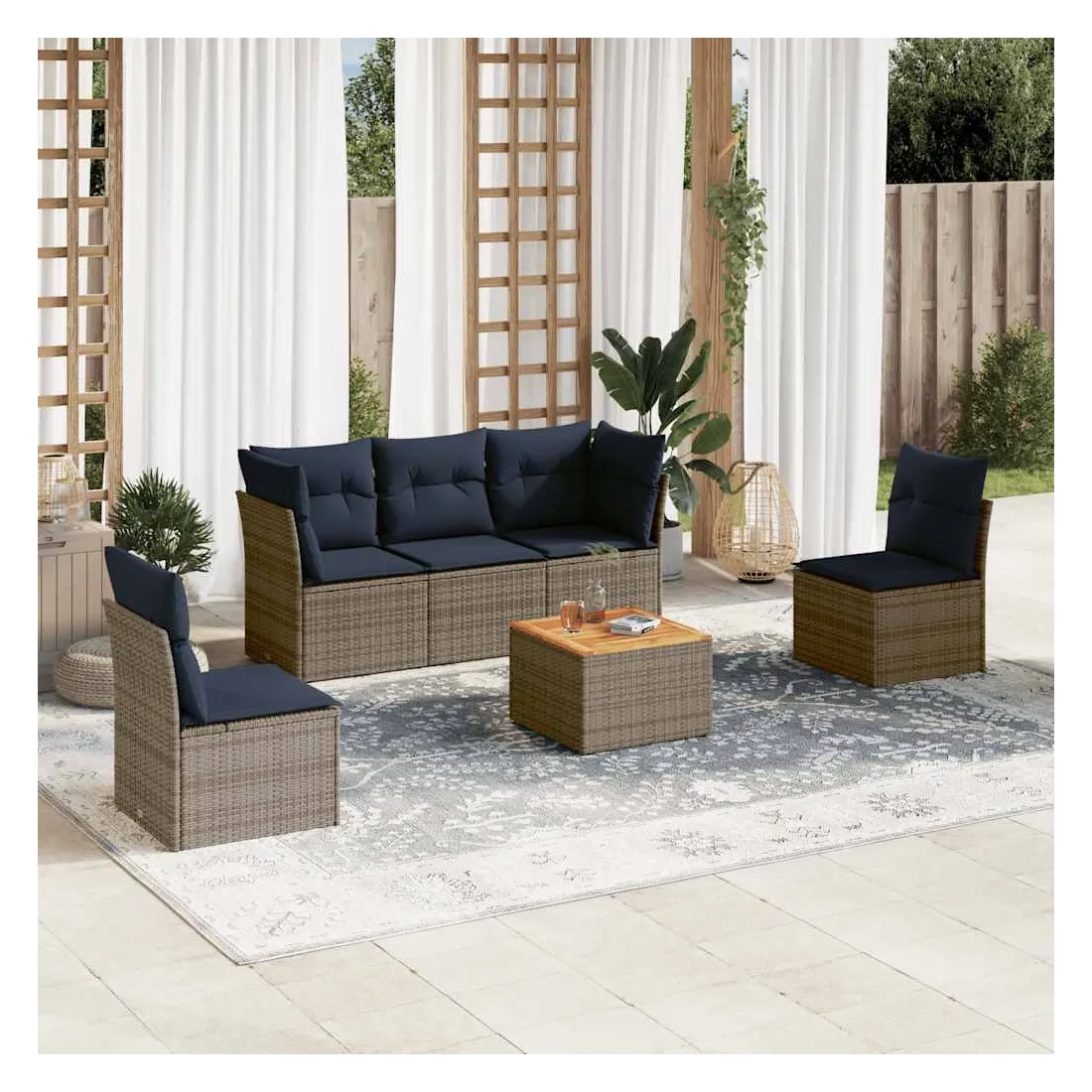 Cet ensemble de canapés de jardin est le complément parfait de votre arrière-cour, terrasse ou patio, offrant un espace confortable et accueillant pour discuter avec la famille et les amis ou simplement se détendre et profiter de l'extérieur. Matériau durable : la résine tressée, également connue sous le nom de poly rotin, est un matériau synthétique solide et nécessitant peu d'entretien qui ressemble au rotin naturel. Il est léger, facile à nettoyer et couramment utilisé pour les meubles d'extérieur en raison de sa durabilité et de ses propriétés de résistance aux intempéries.Fonction de rangement avec sac résistant à l'eau : chaque siège de jardin dispose d'un espace de rangement sous l'assise, complété par un sac résistant à l'eau pour ranger les coussins, les jouets et d'autres objets. Les sacs intérieurs sont dotés d'un couvercle et peuvent être solidement fixés aux sièges à l'aide de bandes auto-agrippantes pour plus de stabilité.Dessus stable et facile à nettoyer : cette table de jardin a un dessus en bois d'acacia robuste, durable et facile à nettoyer avec un chiffon humide.Housse amovible et lavable : ces coussins de siège sont dotés de housses amovibles pour un lavage et un entretien faciles.Conception modulaire : cet ensemble de meubles d'extérieur a une conception modulaire, ce qui le rend complètement flexible et facile à déplacer, afin que vous puissiez créer un agencement de meubles d'extérieur personnalisé. Bon à savoir :Pour que vos meubles d'extérieur restent beaux, nous vous recommandons de les protéger avec une housse imperméable.