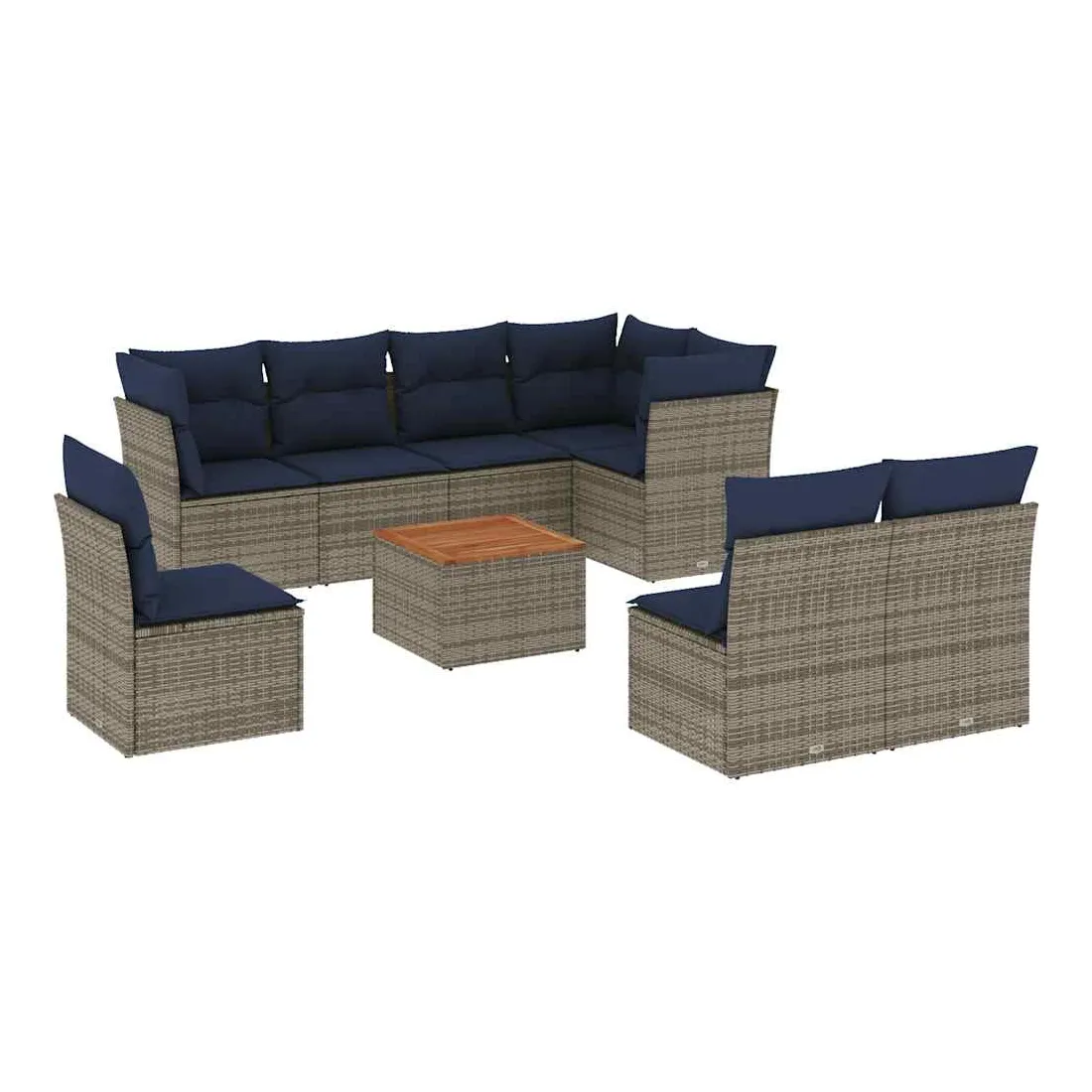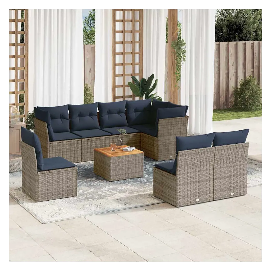 Cet ensemble de canapés de jardin est le complément parfait de votre arrière-cour, terrasse ou patio, offrant un espace confortable et accueillant pour discuter avec la famille et les amis ou simplement se détendre et profiter de l'extérieur. Matériau durable : la résine tressée, également connue sous le nom de poly rotin, est un matériau synthétique solide et nécessitant peu d'entretien qui ressemble au rotin naturel. Il est léger, facile à nettoyer et couramment utilisé pour les meubles d'extérieur en raison de sa durabilité et de ses propriétés de résistance aux intempéries.Fonction de rangement avec sac résistant à l'eau : chaque siège de jardin dispose d'un espace de rangement sous l'assise, complété par un sac résistant à l'eau pour ranger les coussins, les jouets et d'autres objets. Les sacs intérieurs sont dotés d'un couvercle et peuvent être solidement fixés aux sièges à l'aide de bandes auto-agrippantes pour plus de stabilité.Dessus stable et facile à nettoyer : cette table de jardin a un dessus en bois d'acacia robuste, durable et facile à nettoyer avec un chiffon humide.Housse amovible et lavable : ces coussins de siège sont dotés de housses amovibles pour un lavage et un entretien faciles.Conception modulaire : cet ensemble de meubles d'extérieur a une conception modulaire, ce qui le rend complètement flexible et facile à déplacer, afin que vous puissiez créer un agencement de meubles d'extérieur personnalisé. Bon à savoir :Pour que vos meubles d'extérieur restent beaux, nous vous recommandons de les protéger avec une housse imperméable.
