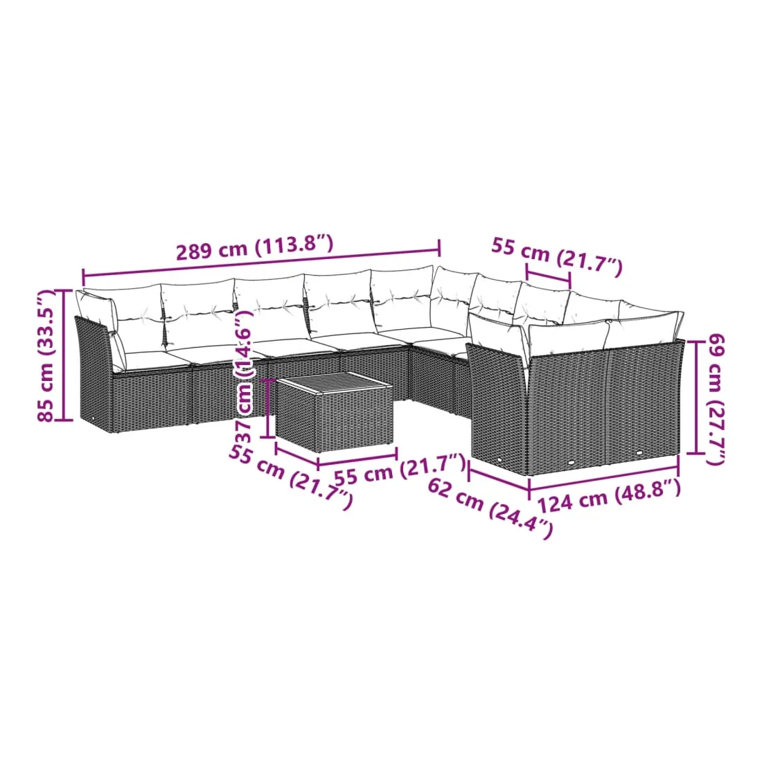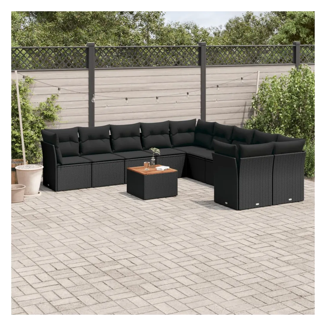 Cet ensemble de canapés de jardin est le complément parfait de votre arrière-cour, terrasse ou patio, offrant un espace confortable et accueillant pour discuter avec la famille et les amis ou simplement se détendre et profiter de l'extérieur. Matériau durable : la résine tressée, également connue sous le nom de poly rotin, est un matériau synthétique solide et nécessitant peu d'entretien qui ressemble au rotin naturel. Il est léger, facile à nettoyer et couramment utilisé pour les meubles d'extérieur en raison de sa durabilité et de ses propriétés de résistance aux intempéries.Fonction de rangement avec sac résistant à l'eau : chaque siège de jardin dispose d'un espace de rangement sous l'assise, complété par un sac résistant à l'eau pour ranger les coussins, les jouets et d'autres objets. Les sacs intérieurs sont dotés d'un couvercle et peuvent être solidement fixés aux sièges à l'aide de bandes auto-agrippantes pour plus de stabilité.Dessus stable et facile à nettoyer : cette table de jardin a un dessus en bois d'acacia robuste, durable et facile à nettoyer avec un chiffon humide.Housse amovible et lavable : ces coussins de siège sont dotés de housses amovibles pour un lavage et un entretien faciles.Conception modulaire : cet ensemble de meubles d'extérieur a une conception modulaire, ce qui le rend complètement flexible et facile à déplacer, afin que vous puissiez créer un agencement de meubles d'extérieur personnalisé. Bon à savoir :Pour que vos meubles d'extérieur restent beaux, nous vous recommandons de les protéger avec une housse imperméable.