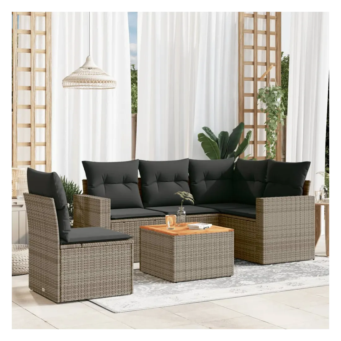 Cet ensemble de canapés de jardin est le complément parfait de votre arrière-cour, terrasse ou patio, offrant un espace confortable et accueillant pour discuter avec la famille et les amis ou simplement se détendre et profiter de l'extérieur. Matériau durable : la résine tressée, également connue sous le nom de poly rotin, est un matériau synthétique solide et nécessitant peu d'entretien qui ressemble au rotin naturel. Il est léger, facile à nettoyer et couramment utilisé pour les meubles d'extérieur en raison de sa durabilité et de ses propriétés de résistance aux intempéries.Fonction de rangement avec sac résistant à l'eau : chaque siège de jardin dispose d'un espace de rangement sous l'assise, complété par un sac résistant à l'eau pour ranger les coussins, les jouets et d'autres objets. Les sacs intérieurs sont dotés d'un couvercle et peuvent être solidement fixés aux sièges à l'aide de bandes auto-agrippantes pour plus de stabilité.Dessus stable et facile à nettoyer : cette table de jardin a un dessus en bois d'acacia robuste, durable et facile à nettoyer avec un chiffon humide.Housse amovible et lavable : ces coussins de siège sont dotés de housses amovibles pour un lavage et un entretien faciles.Conception modulaire : cet ensemble de meubles d'extérieur a une conception modulaire, ce qui le rend complètement flexible et facile à déplacer, afin que vous puissiez créer un agencement de meubles d'extérieur personnalisé. Bon à savoir :Pour que vos meubles d'extérieur restent beaux, nous vous recommandons de les protéger avec une housse imperméable.