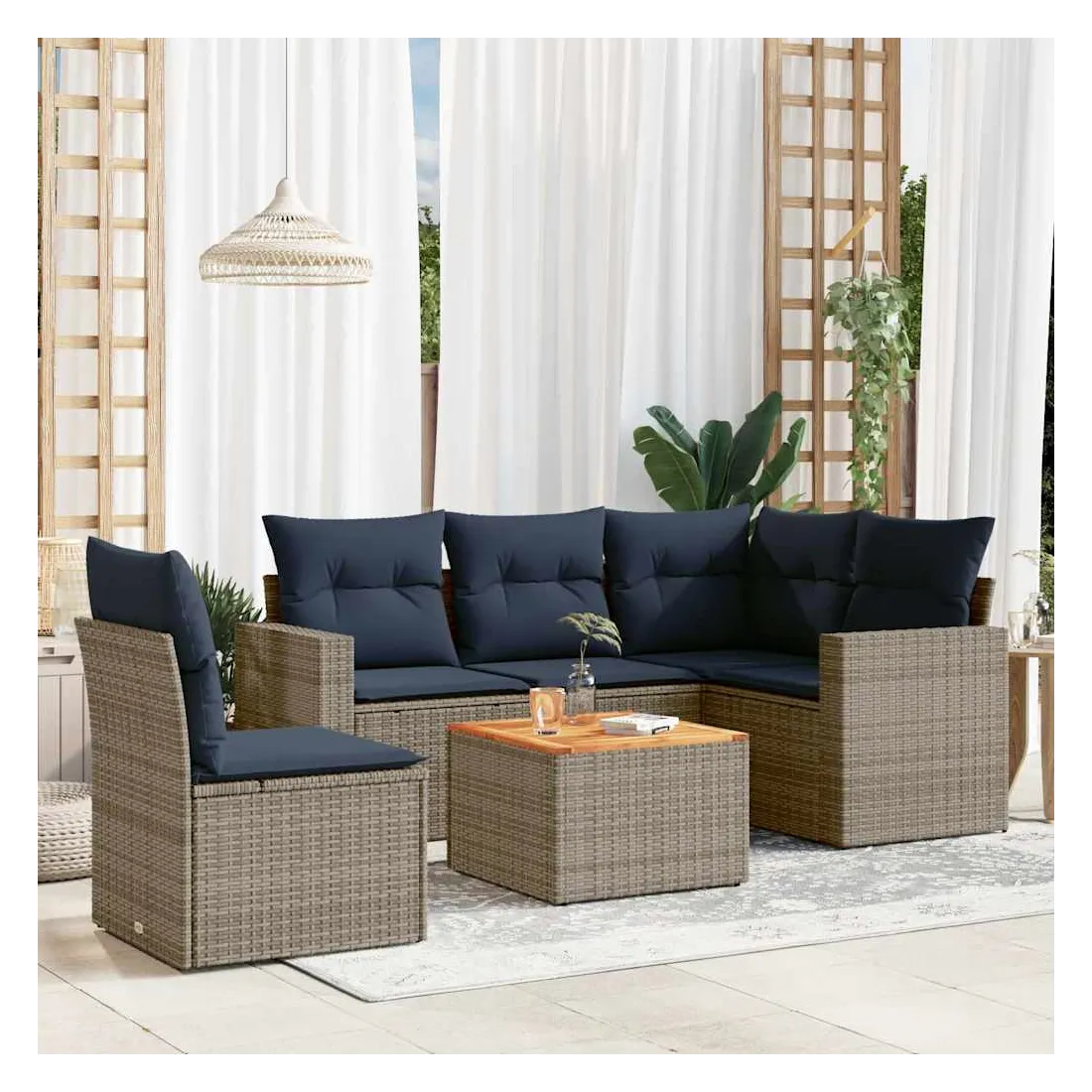 Cet ensemble de canapés de jardin est le complément parfait de votre arrière-cour, terrasse ou patio, offrant un espace confortable et accueillant pour discuter avec la famille et les amis ou simplement se détendre et profiter de l'extérieur. Matériau durable : la résine tressée, également connue sous le nom de poly rotin, est un matériau synthétique solide et nécessitant peu d'entretien qui ressemble au rotin naturel. Il est léger, facile à nettoyer et couramment utilisé pour les meubles d'extérieur en raison de sa durabilité et de ses propriétés de résistance aux intempéries.Fonction de rangement avec sac résistant à l'eau : chaque siège de jardin dispose d'un espace de rangement sous l'assise, complété par un sac résistant à l'eau pour ranger les coussins, les jouets et d'autres objets. Les sacs intérieurs sont dotés d'un couvercle et peuvent être solidement fixés aux sièges à l'aide de bandes auto-agrippantes pour plus de stabilité.Dessus stable et facile à nettoyer : cette table de jardin a un dessus en bois d'acacia robuste, durable et facile à nettoyer avec un chiffon humide.Housse amovible et lavable : ces coussins de siège sont dotés de housses amovibles pour un lavage et un entretien faciles.Conception modulaire : cet ensemble de meubles d'extérieur a une conception modulaire, ce qui le rend complètement flexible et facile à déplacer, afin que vous puissiez créer un agencement de meubles d'extérieur personnalisé. Bon à savoir :Pour que vos meubles d'extérieur restent beaux, nous vous recommandons de les protéger avec une housse imperméable.