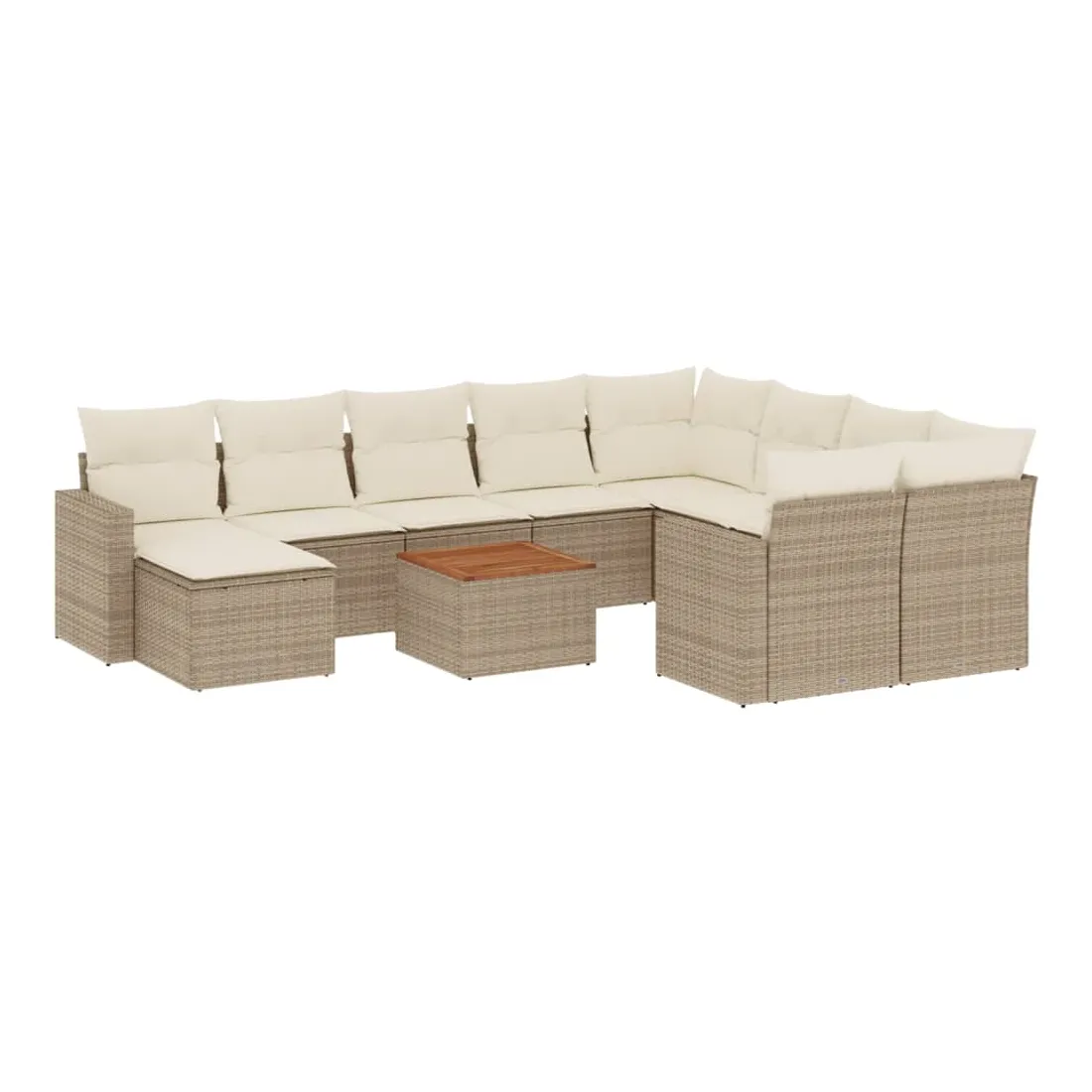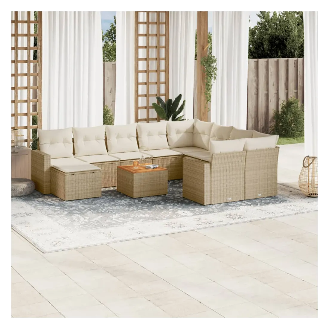 Cet ensemble de canapés de jardin est le complément parfait de votre arrière-cour, terrasse ou patio, offrant un espace confortable et accueillant pour discuter avec la famille et les amis ou simplement se détendre et profiter de l'extérieur. Matériau durable : la résine tressée, également connue sous le nom de poly rotin, est un matériau synthétique solide et nécessitant peu d'entretien qui ressemble au rotin naturel. Il est léger, facile à nettoyer et couramment utilisé pour les meubles d'extérieur en raison de sa durabilité et de ses propriétés de résistance aux intempéries.Fonction de rangement avec sac résistant à l'eau : chaque siège de jardin dispose d'un espace de rangement sous l'assise, complété par un sac résistant à l'eau pour ranger les coussins, les jouets et d'autres objets. Les sacs intérieurs sont dotés d'un couvercle et peuvent être solidement fixés aux sièges à l'aide de bandes auto-agrippantes pour plus de stabilité.Dessus stable et facile à nettoyer : cette table de jardin a un dessus en bois d'acacia robuste, durable et facile à nettoyer avec un chiffon humide.Pouf polyvalent : le tabouret est polyvalent, servant de repose-pieds confortable lorsque vous vous prélassez sur le canapé ou de siège supplémentaire dans votre jardin.Conception modulaire : cet ensemble de meubles d'extérieur a une conception modulaire, ce qui le rend complètement flexible et facile à déplacer, afin que vous puissiez créer un agencement de meubles d'extérieur personnalisé. Bon à savoir :Pour que vos meubles d'extérieur restent beaux, nous vous recommandons de les protéger avec une housse imperméable.