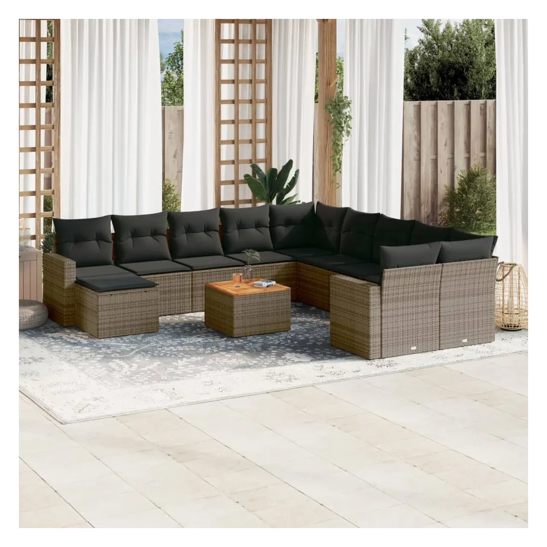 Cet ensemble de canapés de jardin est le complément parfait de votre arrière-cour, terrasse ou patio, offrant un espace confortable et accueillant pour discuter avec la famille et les amis ou simplement se détendre et profiter de l'extérieur. Matériau durable : la résine tressée, également connue sous le nom de poly rotin, est un matériau synthétique solide et nécessitant peu d'entretien qui ressemble au rotin naturel. Il est léger, facile à nettoyer et couramment utilisé pour les meubles d'extérieur en raison de sa durabilité et de ses propriétés de résistance aux intempéries.Fonction de rangement avec sac résistant à l'eau : chaque siège de jardin dispose d'un espace de rangement sous l'assise, complété par un sac résistant à l'eau pour ranger les coussins, les jouets et d'autres objets. Les sacs intérieurs sont dotés d'un couvercle et peuvent être solidement fixés aux sièges à l'aide de bandes auto-agrippantes pour plus de stabilité.Dessus stable et facile à nettoyer : cette table de jardin a un dessus en bois d'acacia robuste, durable et facile à nettoyer avec un chiffon humide.Pouf polyvalent : le tabouret est polyvalent, servant de repose-pieds confortable lorsque vous vous prélassez sur le canapé ou de siège supplémentaire dans votre jardin.Conception modulaire : cet ensemble de meubles d'extérieur a une conception modulaire, ce qui le rend complètement flexible et facile à déplacer, afin que vous puissiez créer un agencement de meubles d'extérieur personnalisé. Bon à savoir :Pour que vos meubles d'extérieur restent beaux, nous vous recommandons de les protéger avec une housse imperméable.