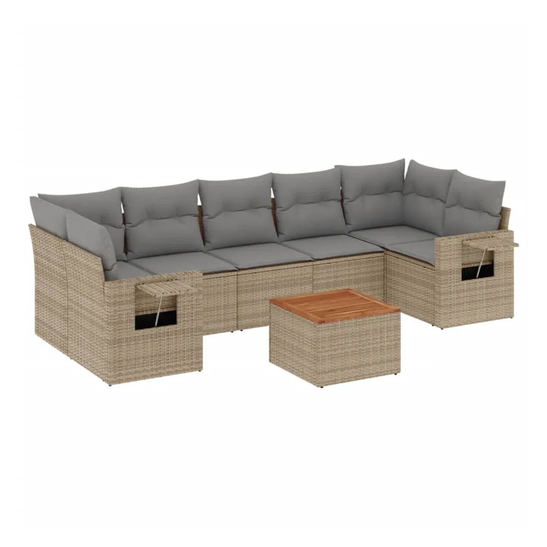 Cet ensemble de canapés de jardin est le complément parfait de votre arrière-cour, terrasse ou patio, offrant un espace confortable et accueillant pour discuter avec la famille et les amis ou simplement se détendre et profiter de l'extérieur. Matériau durable : la résine tressée, également connue sous le nom de poly rotin, est un matériau synthétique solide et nécessitant peu d'entretien qui ressemble au rotin naturel. Il est léger, facile à nettoyer et couramment utilisé pour les meubles d'extérieur en raison de sa durabilité et de ses propriétés de résistance aux intempéries.Fonction de rangement avec sac résistant à l'eau : chaque siège de jardin dispose d'un espace de rangement sous l'assise, complété par un sac résistant à l'eau pour ranger les coussins, les jouets et d'autres objets. Les sacs intérieurs sont dotés d'un couvercle et peuvent être solidement fixés aux sièges à l'aide de bandes auto-agrippantes pour plus de stabilité.Dessus stable et facile à nettoyer : cette table de jardin a un dessus en bois d'acacia robuste, durable et facile à nettoyer avec un chiffon humide.Table d'appoint pratique : ce mobilier d'extérieur comprend des tables d'appoint pliables avec un ressort à gaz sur les accoudoirs, offrant des endroits pratiques pour garder vos essentiels à portée de main.Conception modulaire : cet ensemble de meubles d'extérieur a une conception modulaire, ce qui le rend complètement flexible et facile à déplacer, afin que vous puissiez créer un agencement de meubles d'extérieur personnalisé. Bon à savoir :Pour que vos meubles d'extérieur restent beaux, nous vous recommandons de les protéger avec une housse imperméable.