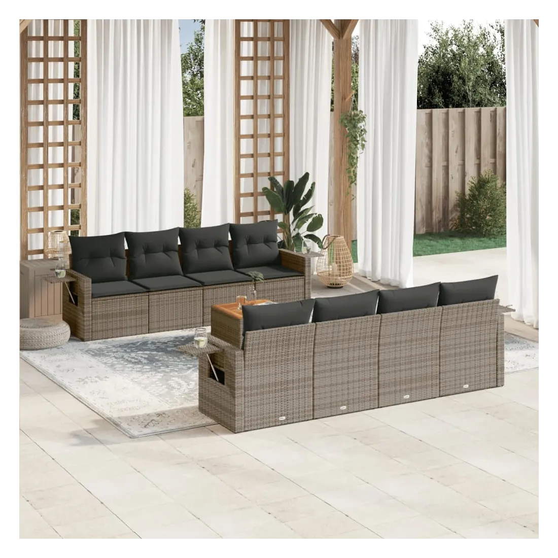 Cet ensemble de canapés de jardin est le complément parfait de votre arrière-cour, terrasse ou patio, offrant un espace confortable et accueillant pour discuter avec la famille et les amis ou simplement se détendre et profiter de l'extérieur. Matériau durable : la résine tressée, également connue sous le nom de poly rotin, est un matériau synthétique solide et nécessitant peu d'entretien qui ressemble au rotin naturel. Il est léger, facile à nettoyer et couramment utilisé pour les meubles d'extérieur en raison de sa durabilité et de ses propriétés de résistance aux intempéries.Fonction de rangement avec sac résistant à l'eau : chaque siège de jardin dispose d'un espace de rangement sous l'assise, complété par un sac résistant à l'eau pour ranger les coussins, les jouets et d'autres objets. Les sacs intérieurs sont dotés d'un couvercle et peuvent être solidement fixés aux sièges à l'aide de bandes auto-agrippantes pour plus de stabilité.Dessus stable et facile à nettoyer : cette table de jardin a un dessus en bois d'acacia robuste, durable et facile à nettoyer avec un chiffon humide.Table d'appoint pratique : ce mobilier d'extérieur comprend des tables d'appoint pliables avec un ressort à gaz sur les accoudoirs, offrant des endroits pratiques pour garder vos essentiels à portée de main.Conception modulaire : cet ensemble de meubles d'extérieur a une conception modulaire, ce qui le rend complètement flexible et facile à déplacer, afin que vous puissiez créer un agencement de meubles d'extérieur personnalisé. Bon à savoir :Pour que vos meubles d'extérieur restent beaux, nous vous recommandons de les protéger avec une housse imperméable.