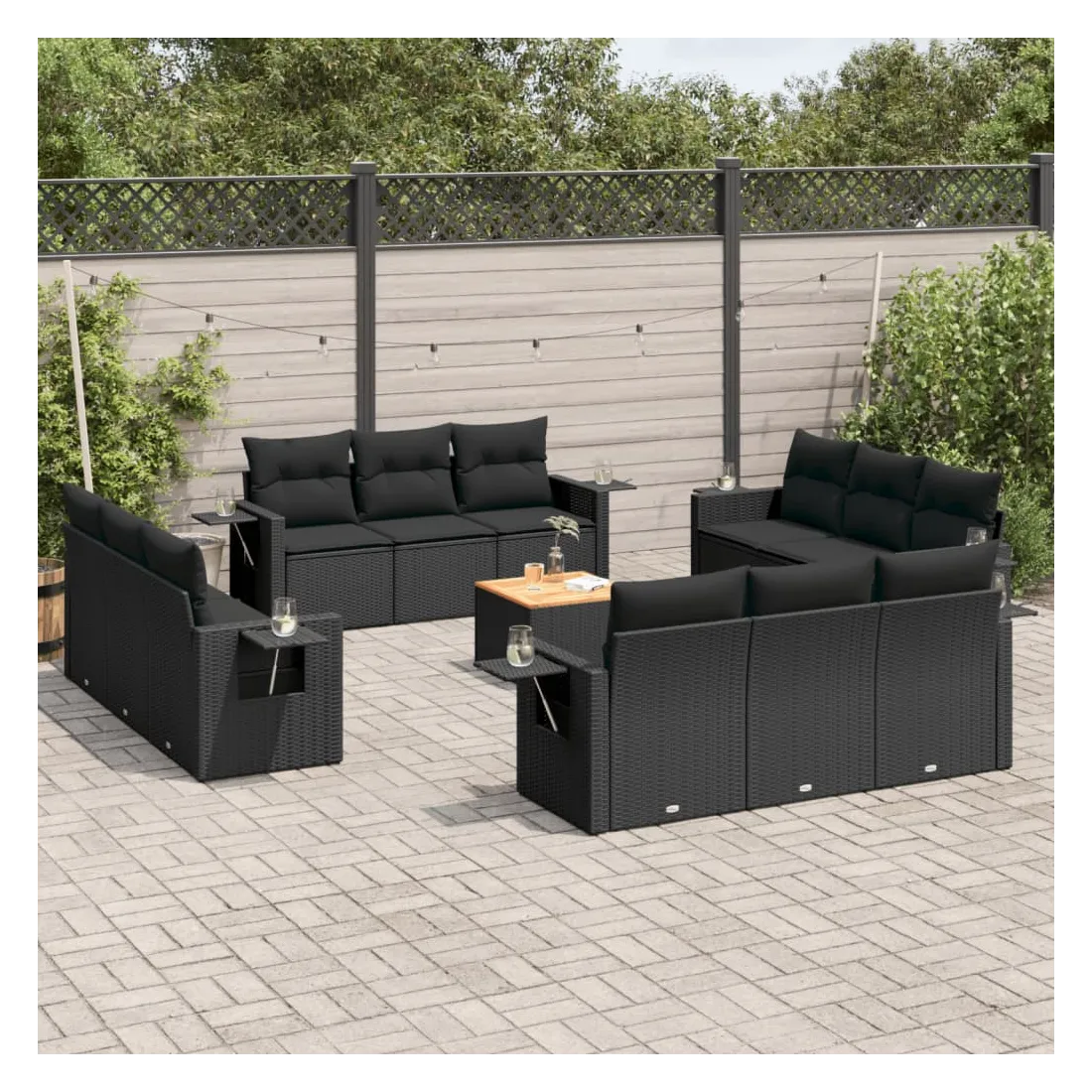 Cet ensemble de canapés de jardin est le complément parfait de votre arrière-cour, terrasse ou patio, offrant un espace confortable et accueillant pour discuter avec la famille et les amis ou simplement se détendre et profiter de l'extérieur. Matériau durable : la résine tressée, également connue sous le nom de poly rotin, est un matériau synthétique solide et nécessitant peu d'entretien qui ressemble au rotin naturel. Il est léger, facile à nettoyer et couramment utilisé pour les meubles d'extérieur en raison de sa durabilité et de ses propriétés de résistance aux intempéries.Fonction de rangement avec sac résistant à l'eau : chaque siège de jardin dispose d'un espace de rangement sous l'assise, complété par un sac résistant à l'eau pour ranger les coussins, les jouets et d'autres objets. Les sacs intérieurs sont dotés d'un couvercle et peuvent être solidement fixés aux sièges à l'aide de bandes auto-agrippantes pour plus de stabilité.Dessus stable et facile à nettoyer : cette table de jardin a un dessus en bois d'acacia robuste, durable et facile à nettoyer avec un chiffon humide.Table d'appoint pratique : ce mobilier d'extérieur comprend des tables d'appoint pliables avec un ressort à gaz sur les accoudoirs, offrant des endroits pratiques pour garder vos essentiels à portée de main.Conception modulaire : cet ensemble de meubles d'extérieur a une conception modulaire, ce qui le rend complètement flexible et facile à déplacer, afin que vous puissiez créer un agencement de meubles d'extérieur personnalisé. Bon à savoir :Pour que vos meubles d'extérieur restent beaux, nous vous recommandons de les protéger avec une housse imperméable.