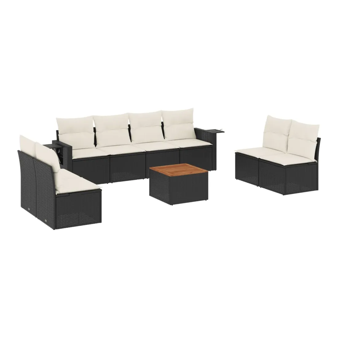Cet ensemble de canapés de jardin est le complément parfait de votre arrière-cour, terrasse ou patio, offrant un espace confortable et accueillant pour discuter avec la famille et les amis ou simplement se détendre et profiter de l'extérieur. Matériau durable : la résine tressée, également connue sous le nom de poly rotin, est un matériau synthétique solide et nécessitant peu d'entretien qui ressemble au rotin naturel. Il est léger, facile à nettoyer et couramment utilisé pour les meubles d'extérieur en raison de sa durabilité et de ses propriétés de résistance aux intempéries.Fonction de rangement avec sac résistant à l'eau : chaque siège de jardin dispose d'un espace de rangement sous l'assise, complété par un sac résistant à l'eau pour ranger les coussins, les jouets et d'autres objets. Les sacs intérieurs sont dotés d'un couvercle et peuvent être solidement fixés aux sièges à l'aide de bandes auto-agrippantes pour plus de stabilité.Dessus stable et facile à nettoyer : cette table de jardin a un dessus en bois d'acacia robuste, durable et facile à nettoyer avec un chiffon humide.Table d'appoint pratique : ce mobilier d'extérieur comprend des tables d'appoint pliables avec un ressort à gaz sur les accoudoirs, offrant des endroits pratiques pour garder vos essentiels à portée de main.Conception modulaire : cet ensemble de meubles d'extérieur a une conception modulaire, ce qui le rend complètement flexible et facile à déplacer, afin que vous puissiez créer un agencement de meubles d'extérieur personnalisé. Bon à savoir :Pour que vos meubles d'extérieur restent beaux, nous vous recommandons de les protéger avec une housse imperméable.