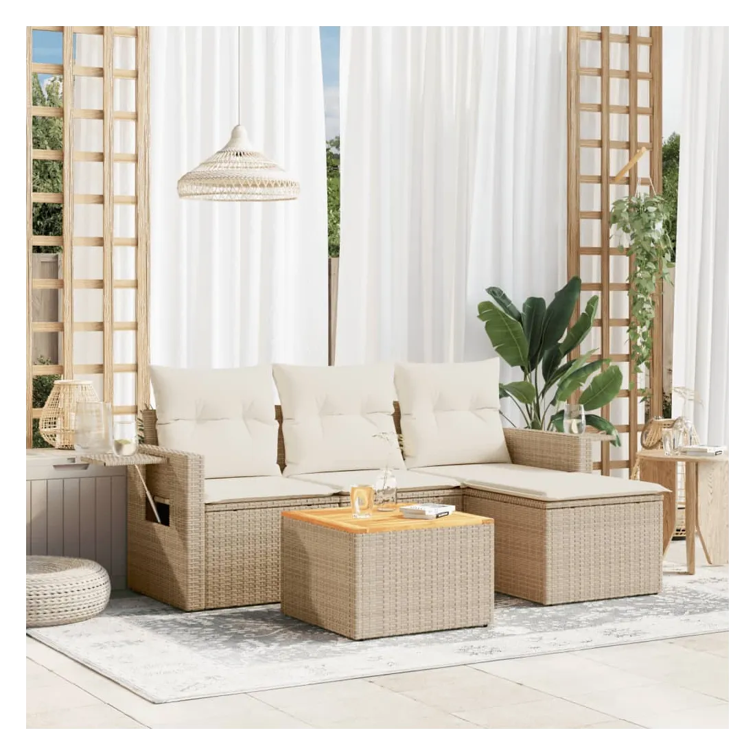 Cet ensemble de canapés de jardin est le complément parfait de votre arrière-cour, terrasse ou patio, offrant un espace confortable et accueillant pour discuter avec la famille et les amis ou simplement se détendre et profiter de l'extérieur. Matériau durable : la résine tressée, également connue sous le nom de poly rotin, est un matériau synthétique solide et nécessitant peu d'entretien qui ressemble au rotin naturel. Il est léger, facile à nettoyer et couramment utilisé pour les meubles d'extérieur en raison de sa durabilité et de ses propriétés de résistance aux intempéries.Fonction de rangement avec sac résistant à l'eau : chaque siège de jardin dispose d'un espace de rangement sous l'assise, complété par un sac résistant à l'eau pour ranger les coussins, les jouets et d'autres objets. Les sacs intérieurs sont dotés d'un couvercle et peuvent être solidement fixés aux sièges à l'aide de bandes auto-agrippantes pour plus de stabilité.Dessus stable et facile à nettoyer : cette table de jardin a un dessus en bois d'acacia robuste, durable et facile à nettoyer avec un chiffon humide.Table d'appoint pratique : ce mobilier d'extérieur comprend des tables d'appoint pliables avec un ressort à gaz sur les accoudoirs, offrant des endroits pratiques pour garder vos essentiels à portée de main.Conception modulaire : cet ensemble de meubles d'extérieur a une conception modulaire, ce qui le rend complètement flexible et facile à déplacer, afin que vous puissiez créer un agencement de meubles d'extérieur personnalisé. Bon à savoir :Pour que vos meubles d'extérieur restent beaux, nous vous recommandons de les protéger avec une housse imperméable.