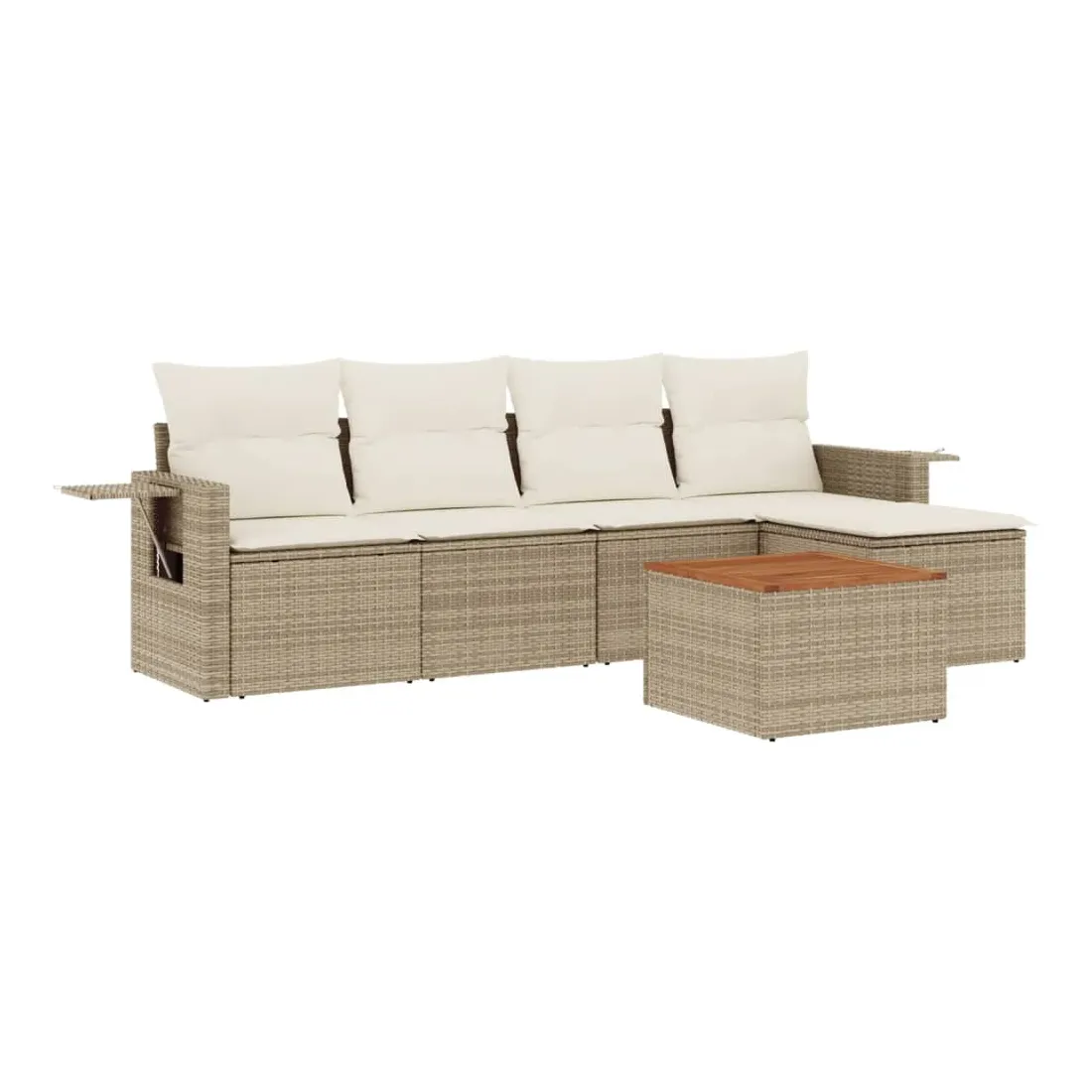 Cet ensemble de canapés de jardin est le complément parfait de votre arrière-cour, terrasse ou patio, offrant un espace confortable et accueillant pour discuter avec la famille et les amis ou simplement se détendre et profiter de l'extérieur. Matériau durable : la résine tressée, également connue sous le nom de poly rotin, est un matériau synthétique solide et nécessitant peu d'entretien qui ressemble au rotin naturel. Il est léger, facile à nettoyer et couramment utilisé pour les meubles d'extérieur en raison de sa durabilité et de ses propriétés de résistance aux intempéries.Fonction de rangement avec sac résistant à l'eau : chaque siège de jardin dispose d'un espace de rangement sous l'assise, complété par un sac résistant à l'eau pour ranger les coussins, les jouets et d'autres objets. Les sacs intérieurs sont dotés d'un couvercle et peuvent être solidement fixés aux sièges à l'aide de bandes auto-agrippantes pour plus de stabilité.Dessus stable et facile à nettoyer : cette table de jardin a un dessus en bois d'acacia robuste, durable et facile à nettoyer avec un chiffon humide.Table d'appoint pratique : ce mobilier d'extérieur comprend des tables d'appoint pliables avec un ressort à gaz sur les accoudoirs, offrant des endroits pratiques pour garder vos essentiels à portée de main.Conception modulaire : cet ensemble de meubles d'extérieur a une conception modulaire, ce qui le rend complètement flexible et facile à déplacer, afin que vous puissiez créer un agencement de meubles d'extérieur personnalisé. Bon à savoir :Pour que vos meubles d'extérieur restent beaux, nous vous recommandons de les protéger avec une housse imperméable.