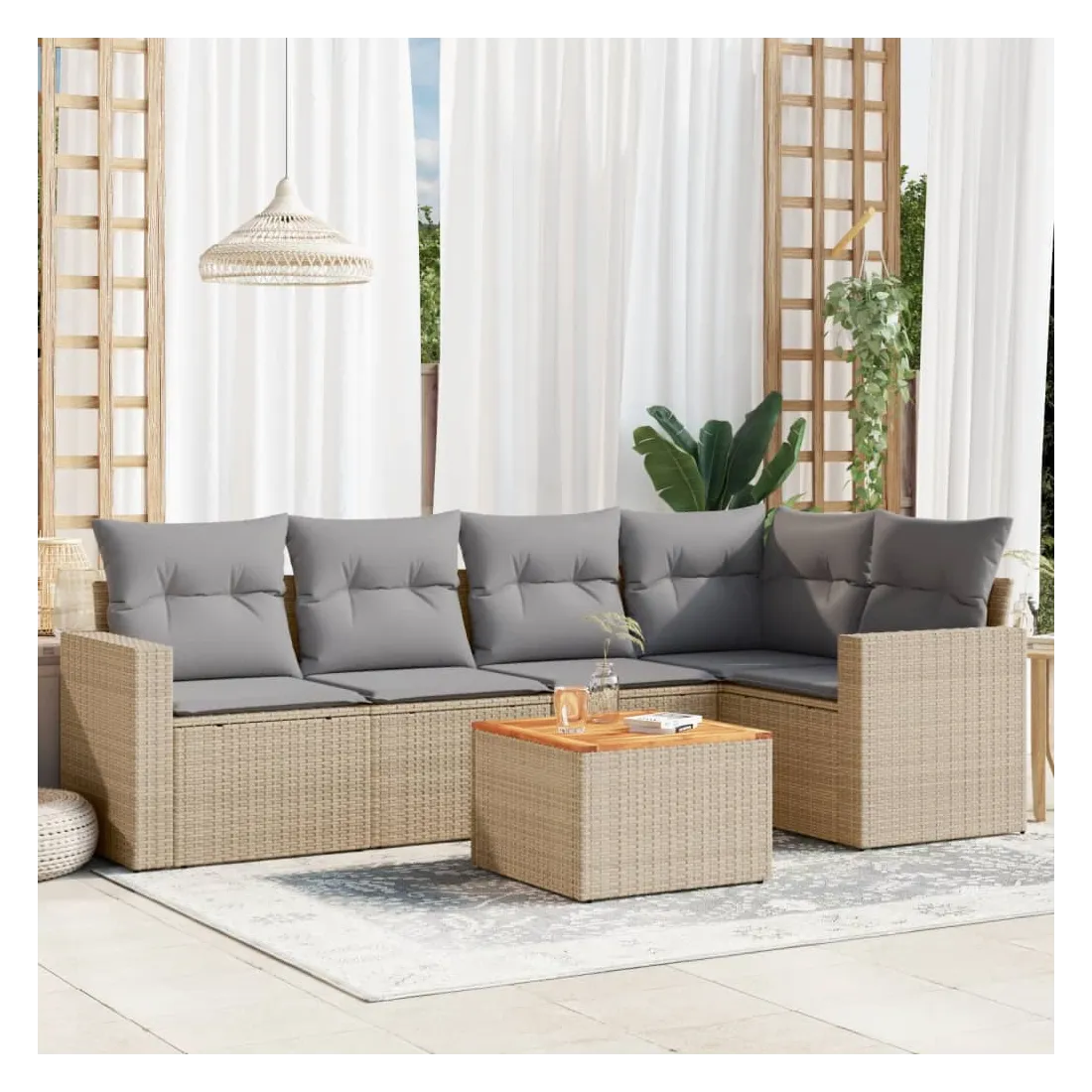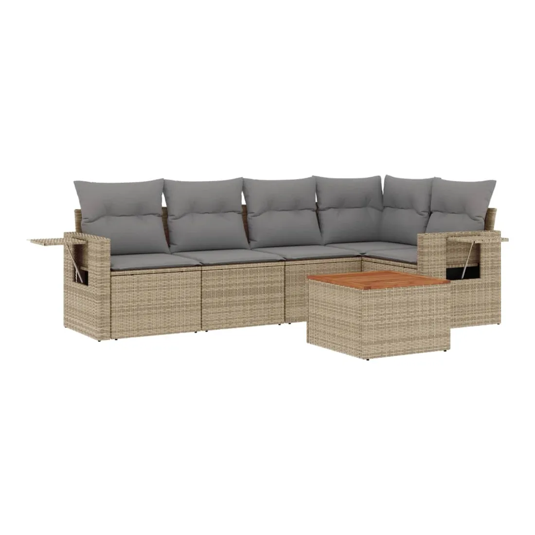 Cet ensemble de canapés de jardin est le complément parfait de votre arrière-cour, terrasse ou patio, offrant un espace confortable et accueillant pour discuter avec la famille et les amis ou simplement se détendre et profiter de l'extérieur. Matériau durable : la résine tressée, également connue sous le nom de poly rotin, est un matériau synthétique solide et nécessitant peu d'entretien qui ressemble au rotin naturel. Il est léger, facile à nettoyer et couramment utilisé pour les meubles d'extérieur en raison de sa durabilité et de ses propriétés de résistance aux intempéries.Fonction de rangement avec sac résistant à l'eau : chaque siège de jardin dispose d'un espace de rangement sous l'assise, complété par un sac résistant à l'eau pour ranger les coussins, les jouets et d'autres objets. Les sacs intérieurs sont dotés d'un couvercle et peuvent être solidement fixés aux sièges à l'aide de bandes auto-agrippantes pour plus de stabilité.Dessus stable et facile à nettoyer : cette table de jardin a un dessus en bois d'acacia robuste, durable et facile à nettoyer avec un chiffon humide.Table d'appoint pratique : ce mobilier d'extérieur comprend des tables d'appoint pliables avec un ressort à gaz sur les accoudoirs, offrant des endroits pratiques pour garder vos essentiels à portée de main.Conception modulaire : cet ensemble de meubles d'extérieur a une conception modulaire, ce qui le rend complètement flexible et facile à déplacer, afin que vous puissiez créer un agencement de meubles d'extérieur personnalisé. Bon à savoir :Pour que vos meubles d'extérieur restent beaux, nous vous recommandons de les protéger avec une housse imperméable.