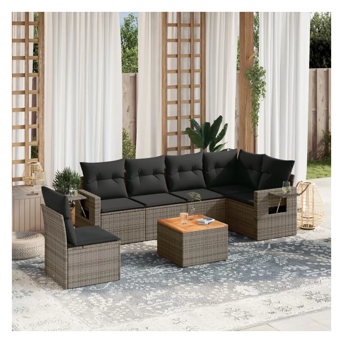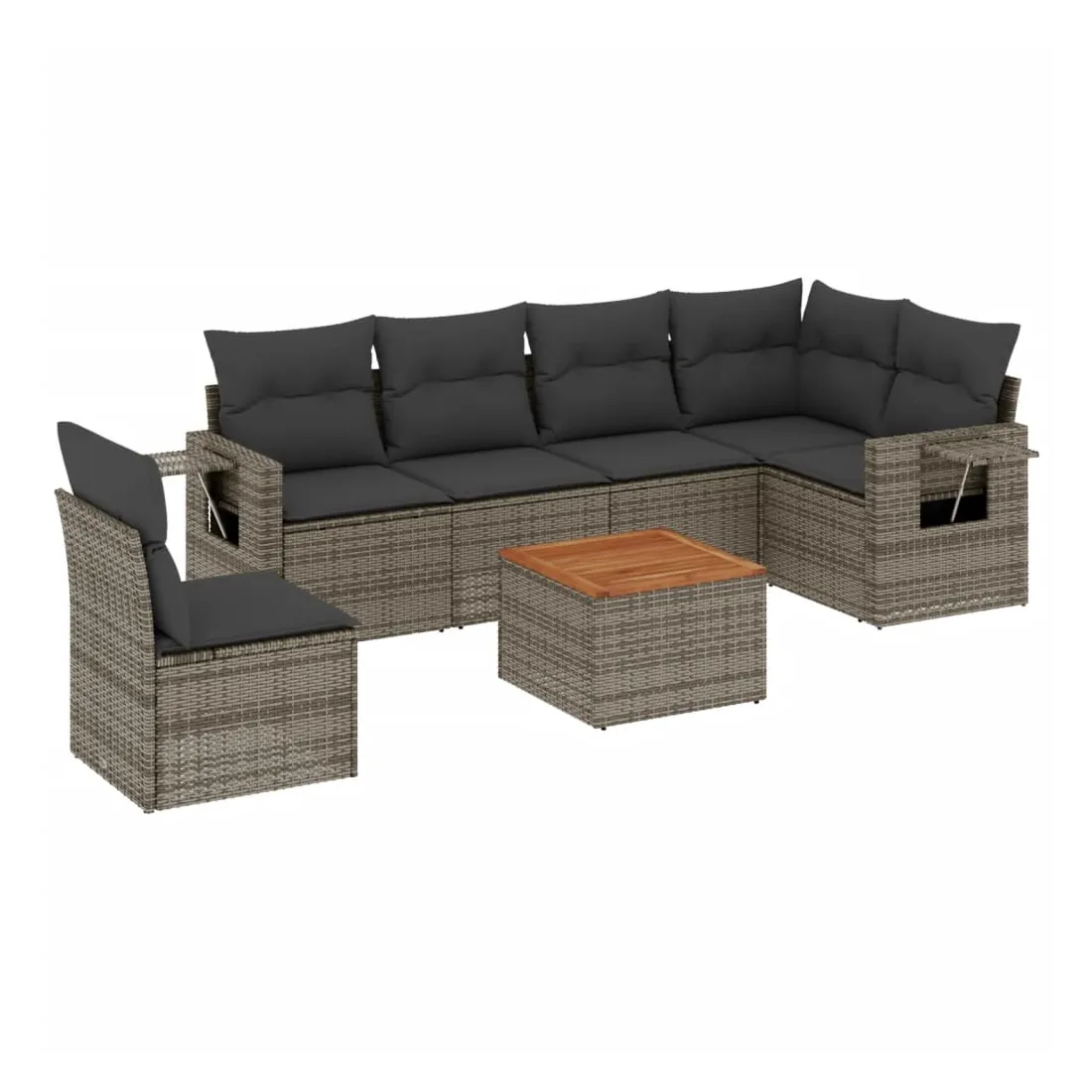 Cet ensemble de canapés de jardin est le complément parfait de votre arrière-cour, terrasse ou patio, offrant un espace confortable et accueillant pour discuter avec la famille et les amis ou simplement se détendre et profiter de l'extérieur. Matériau durable : la résine tressée, également connue sous le nom de poly rotin, est un matériau synthétique solide et nécessitant peu d'entretien qui ressemble au rotin naturel. Il est léger, facile à nettoyer et couramment utilisé pour les meubles d'extérieur en raison de sa durabilité et de ses propriétés de résistance aux intempéries.Fonction de rangement avec sac résistant à l'eau : chaque siège de jardin dispose d'un espace de rangement sous l'assise, complété par un sac résistant à l'eau pour ranger les coussins, les jouets et d'autres objets. Les sacs intérieurs sont dotés d'un couvercle et peuvent être solidement fixés aux sièges à l'aide de bandes auto-agrippantes pour plus de stabilité.Dessus stable et facile à nettoyer : cette table de jardin a un dessus en bois d'acacia robuste, durable et facile à nettoyer avec un chiffon humide.Table d'appoint pratique : ce mobilier d'extérieur comprend des tables d'appoint pliables avec un ressort à gaz sur les accoudoirs, offrant des endroits pratiques pour garder vos essentiels à portée de main.Conception modulaire : cet ensemble de meubles d'extérieur a une conception modulaire, ce qui le rend complètement flexible et facile à déplacer, afin que vous puissiez créer un agencement de meubles d'extérieur personnalisé. Bon à savoir :Pour que vos meubles d'extérieur restent beaux, nous vous recommandons de les protéger avec une housse imperméable.