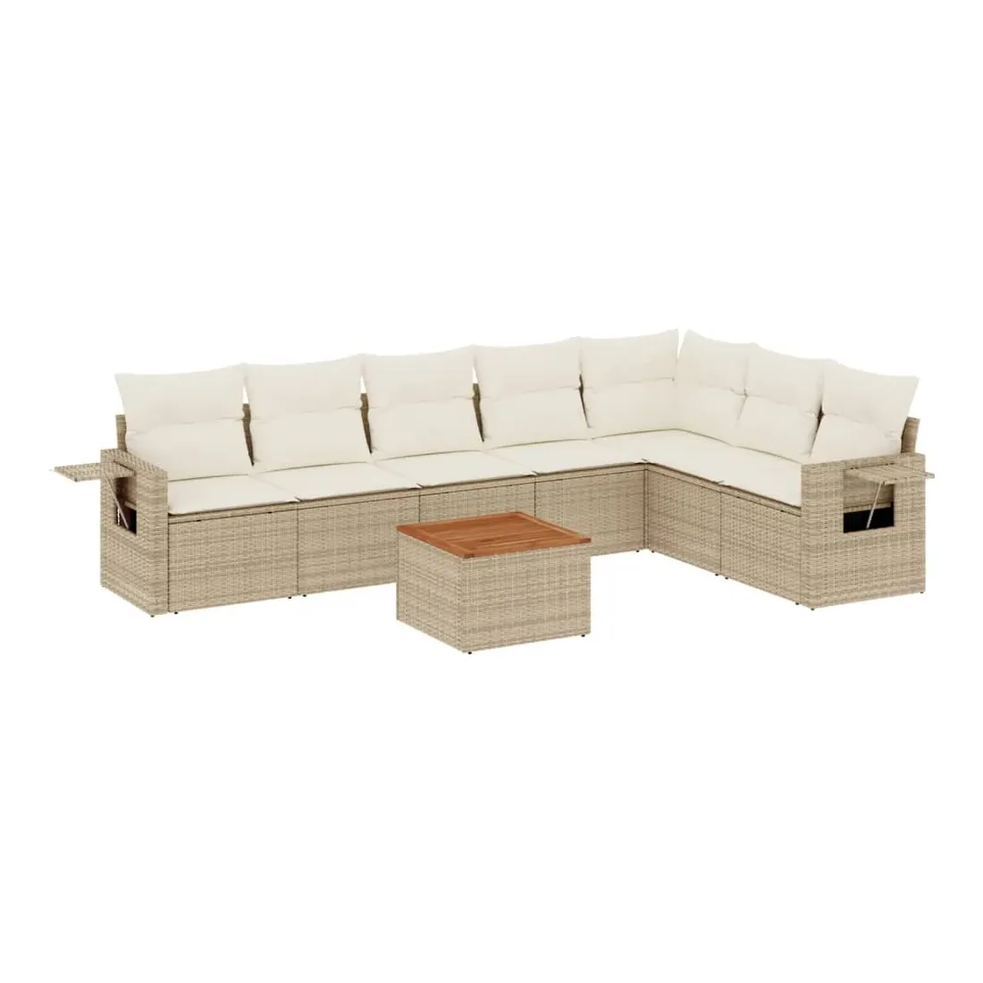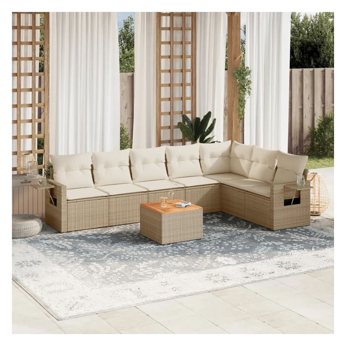 Cet ensemble de canapés de jardin est le complément parfait de votre arrière-cour, terrasse ou patio, offrant un espace confortable et accueillant pour discuter avec la famille et les amis ou simplement se détendre et profiter de l'extérieur. Matériau durable : la résine tressée, également connue sous le nom de poly rotin, est un matériau synthétique solide et nécessitant peu d'entretien qui ressemble au rotin naturel. Il est léger, facile à nettoyer et couramment utilisé pour les meubles d'extérieur en raison de sa durabilité et de ses propriétés de résistance aux intempéries.Fonction de rangement avec sac résistant à l'eau : chaque siège de jardin dispose d'un espace de rangement sous l'assise, complété par un sac résistant à l'eau pour ranger les coussins, les jouets et d'autres objets. Les sacs intérieurs sont dotés d'un couvercle et peuvent être solidement fixés aux sièges à l'aide de bandes auto-agrippantes pour plus de stabilité.Dessus stable et facile à nettoyer : cette table de jardin a un dessus en bois d'acacia robuste, durable et facile à nettoyer avec un chiffon humide.Table d'appoint pratique : ce mobilier d'extérieur comprend des tables d'appoint pliables avec un ressort à gaz sur les accoudoirs, offrant des endroits pratiques pour garder vos essentiels à portée de main.Conception modulaire : cet ensemble de meubles d'extérieur a une conception modulaire, ce qui le rend complètement flexible et facile à déplacer, afin que vous puissiez créer un agencement de meubles d'extérieur personnalisé. Bon à savoir :Pour que vos meubles d'extérieur restent beaux, nous vous recommandons de les protéger avec une housse imperméable.