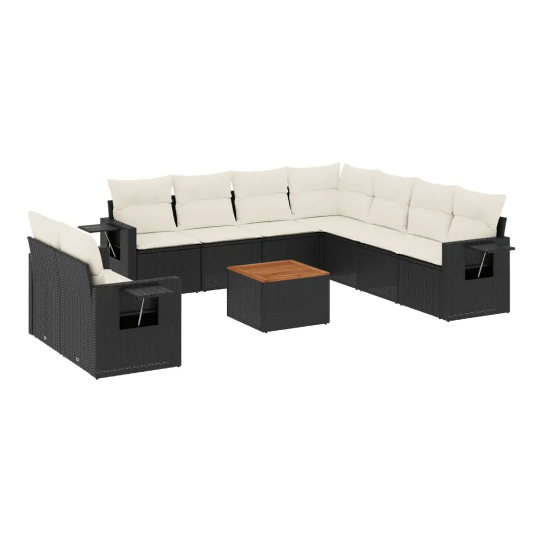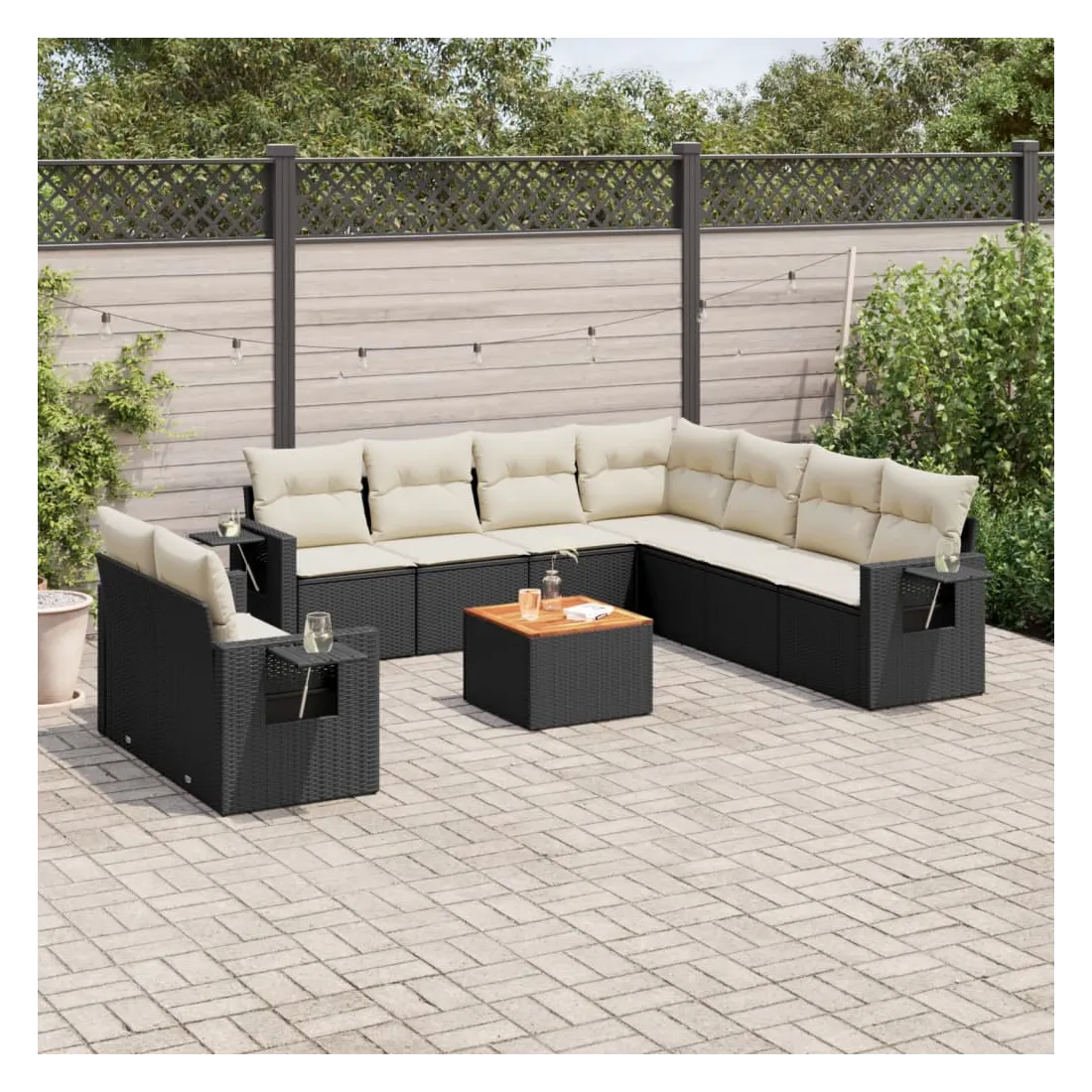 Cet ensemble de canapés de jardin est le complément parfait de votre arrière-cour, terrasse ou patio, offrant un espace confortable et accueillant pour discuter avec la famille et les amis ou simplement se détendre et profiter de l'extérieur. Matériau durable : la résine tressée, également connue sous le nom de poly rotin, est un matériau synthétique solide et nécessitant peu d'entretien qui ressemble au rotin naturel. Il est léger, facile à nettoyer et couramment utilisé pour les meubles d'extérieur en raison de sa durabilité et de ses propriétés de résistance aux intempéries.Fonction de rangement avec sac résistant à l'eau : chaque siège de jardin dispose d'un espace de rangement sous l'assise, complété par un sac résistant à l'eau pour ranger les coussins, les jouets et d'autres objets. Les sacs intérieurs sont dotés d'un couvercle et peuvent être solidement fixés aux sièges à l'aide de bandes auto-agrippantes pour plus de stabilité.Dessus stable et facile à nettoyer : cette table de jardin a un dessus en bois d'acacia robuste, durable et facile à nettoyer avec un chiffon humide.Table d'appoint pratique : ce mobilier d'extérieur comprend des tables d'appoint pliables avec un ressort à gaz sur les accoudoirs, offrant des endroits pratiques pour garder vos essentiels à portée de main.Conception modulaire : cet ensemble de meubles d'extérieur a une conception modulaire, ce qui le rend complètement flexible et facile à déplacer, afin que vous puissiez créer un agencement de meubles d'extérieur personnalisé. Bon à savoir :Pour que vos meubles d'extérieur restent beaux, nous vous recommandons de les protéger avec une housse imperméable.