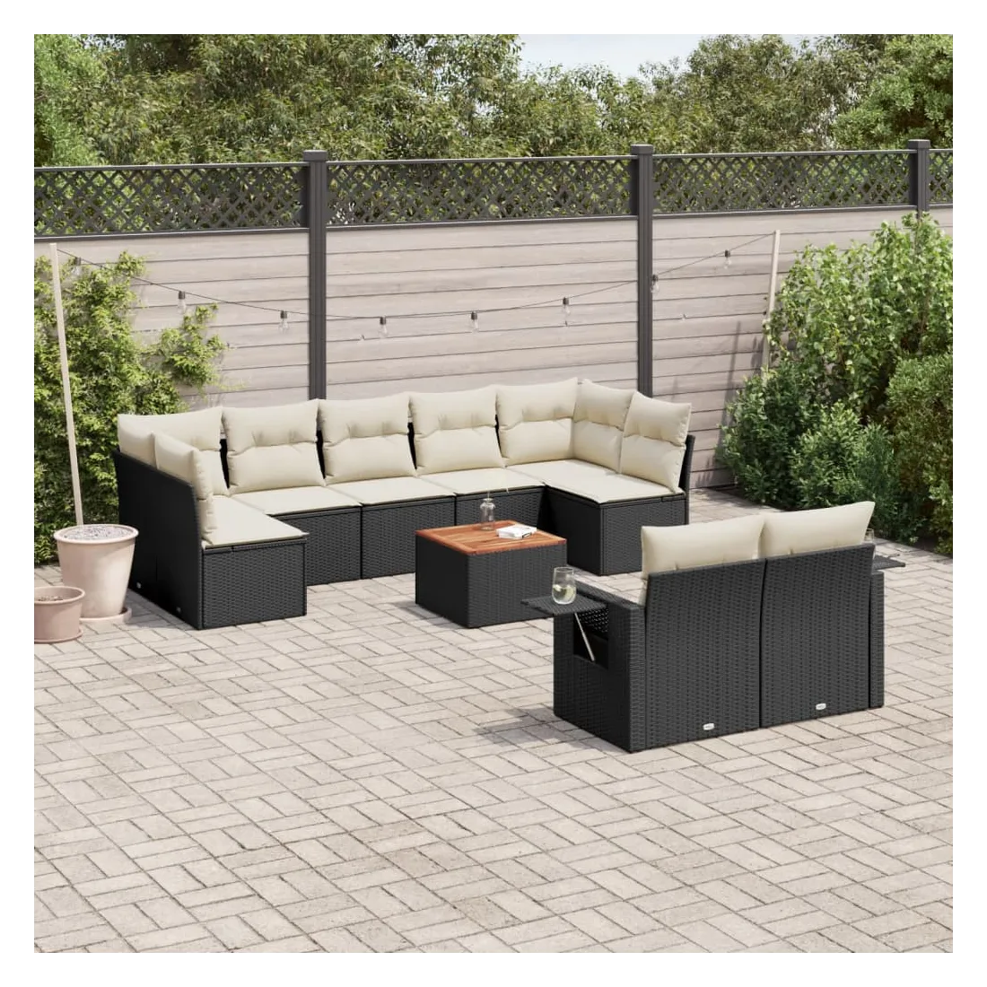 Cet ensemble de canapés de jardin est le complément parfait de votre arrière-cour, terrasse ou patio, offrant un espace confortable et accueillant pour discuter avec la famille et les amis ou simplement se détendre et profiter de l'extérieur. Matériau durable : la résine tressée, également connue sous le nom de poly rotin, est un matériau synthétique solide et nécessitant peu d'entretien qui ressemble au rotin naturel. Il est léger, facile à nettoyer et couramment utilisé pour les meubles d'extérieur en raison de sa durabilité et de ses propriétés de résistance aux intempéries.Fonction de rangement avec sac résistant à l'eau : chaque siège de jardin dispose d'un espace de rangement sous l'assise, complété par un sac résistant à l'eau pour ranger les coussins, les jouets et d'autres objets. Les sacs intérieurs sont dotés d'un couvercle et peuvent être solidement fixés aux sièges à l'aide de bandes auto-agrippantes pour plus de stabilité.Dessus stable et facile à nettoyer : cette table de jardin a un dessus en bois d'acacia robuste, durable et facile à nettoyer avec un chiffon humide.Table d'appoint pratique : ce mobilier d'extérieur comprend des tables d'appoint pliables avec un ressort à gaz sur les accoudoirs, offrant des endroits pratiques pour garder vos essentiels à portée de main.Conception modulaire : cet ensemble de meubles d'extérieur a une conception modulaire, ce qui le rend complètement flexible et facile à déplacer, afin que vous puissiez créer un agencement de meubles d'extérieur personnalisé. Bon à savoir :Pour que vos meubles d'extérieur restent beaux, nous vous recommandons de les protéger avec une housse imperméable.