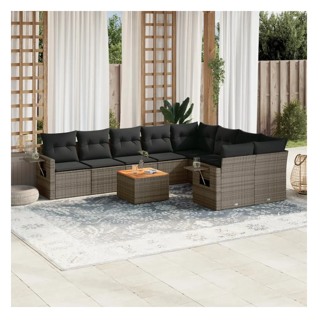 Cet ensemble de canapés de jardin est le complément parfait de votre arrière-cour, terrasse ou patio, offrant un espace confortable et accueillant pour discuter avec la famille et les amis ou simplement se détendre et profiter de l'extérieur. Matériau durable : la résine tressée, également connue sous le nom de poly rotin, est un matériau synthétique solide et nécessitant peu d'entretien qui ressemble au rotin naturel. Il est léger, facile à nettoyer et couramment utilisé pour les meubles d'extérieur en raison de sa durabilité et de ses propriétés de résistance aux intempéries.Fonction de rangement avec sac résistant à l'eau : chaque siège de jardin dispose d'un espace de rangement sous l'assise, complété par un sac résistant à l'eau pour ranger les coussins, les jouets et d'autres objets. Les sacs intérieurs sont dotés d'un couvercle et peuvent être solidement fixés aux sièges à l'aide de bandes auto-agrippantes pour plus de stabilité.Dessus stable et facile à nettoyer : cette table de jardin a un dessus en bois d'acacia robuste, durable et facile à nettoyer avec un chiffon humide.Table d'appoint pratique : ce mobilier d'extérieur comprend des tables d'appoint pliables avec un ressort à gaz sur les accoudoirs, offrant des endroits pratiques pour garder vos essentiels à portée de main.Conception modulaire : cet ensemble de meubles d'extérieur a une conception modulaire, ce qui le rend complètement flexible et facile à déplacer, afin que vous puissiez créer un agencement de meubles d'extérieur personnalisé. Bon à savoir :Pour que vos meubles d'extérieur restent beaux, nous vous recommandons de les protéger avec une housse imperméable.