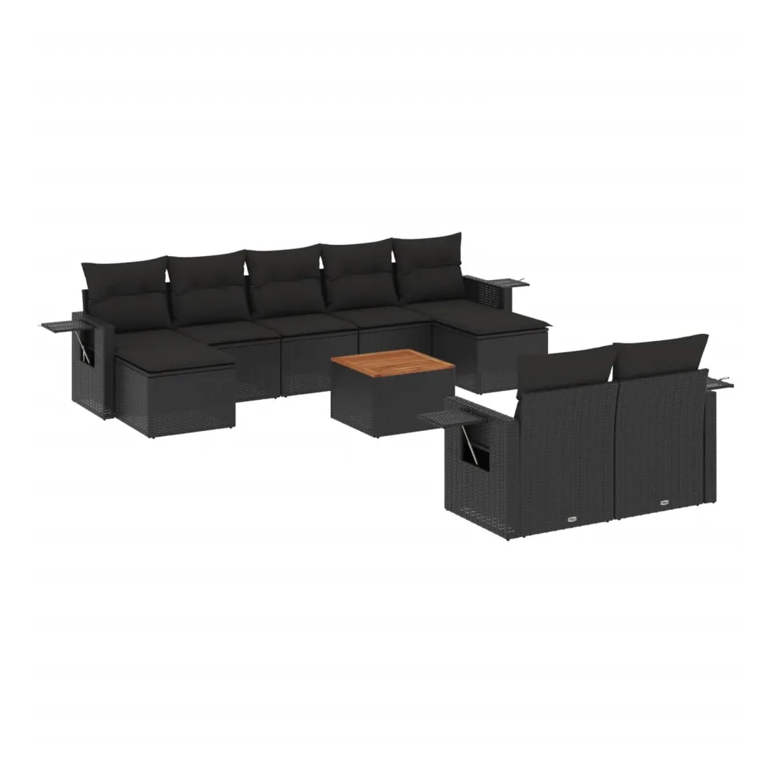 Cet ensemble de canapés de jardin est le complément parfait de votre arrière-cour, terrasse ou patio, offrant un espace confortable et accueillant pour discuter avec la famille et les amis ou simplement se détendre et profiter de l'extérieur. Matériau durable : la résine tressée, également connue sous le nom de poly rotin, est un matériau synthétique solide et nécessitant peu d'entretien qui ressemble au rotin naturel. Il est léger, facile à nettoyer et couramment utilisé pour les meubles d'extérieur en raison de sa durabilité et de ses propriétés de résistance aux intempéries.Fonction de rangement avec sac résistant à l'eau : chaque siège de jardin dispose d'un espace de rangement sous l'assise, complété par un sac résistant à l'eau pour ranger les coussins, les jouets et d'autres objets. Les sacs intérieurs sont dotés d'un couvercle et peuvent être solidement fixés aux sièges à l'aide de bandes auto-agrippantes pour plus de stabilité.Dessus stable et facile à nettoyer : cette table de jardin a un dessus en bois d'acacia robuste, durable et facile à nettoyer avec un chiffon humide.Table d'appoint pratique : ce mobilier d'extérieur comprend des tables d'appoint pliables avec un ressort à gaz sur les accoudoirs, offrant des endroits pratiques pour garder vos essentiels à portée de main.Conception modulaire : cet ensemble de meubles d'extérieur a une conception modulaire, ce qui le rend complètement flexible et facile à déplacer, afin que vous puissiez créer un agencement de meubles d'extérieur personnalisé. Bon à savoir :Pour que vos meubles d'extérieur restent beaux, nous vous recommandons de les protéger avec une housse imperméable.